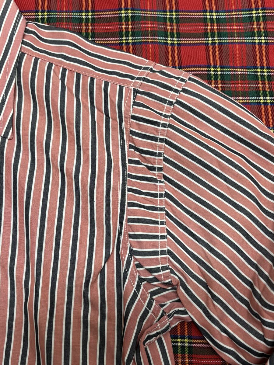 1970年代頃のヴィンテージ のドレスシャツです。赤黒のストライプというのがまず良い配色ですし肩の切り替えが