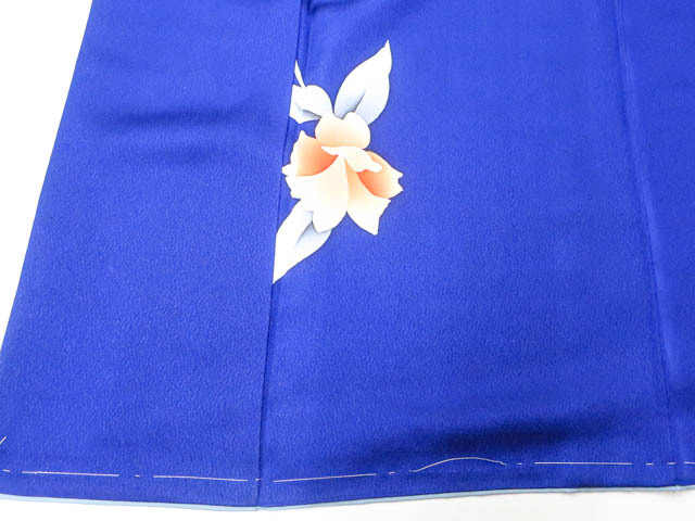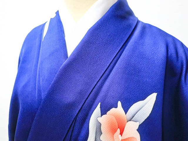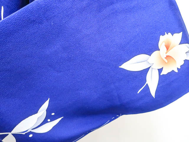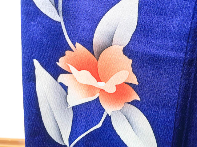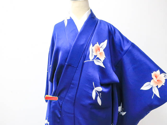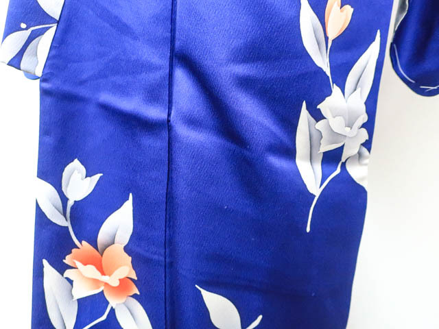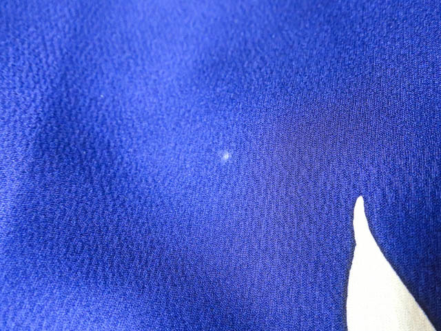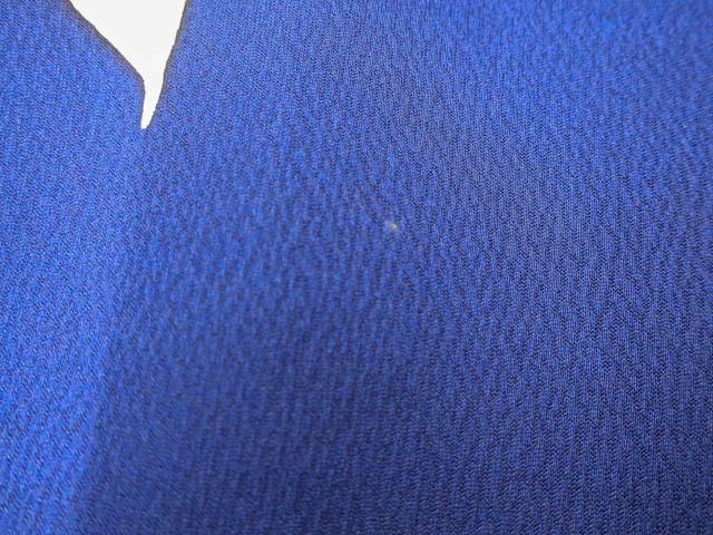 リサイクル商品のため、左後ろ身頃背・左袖に薄汚れがございますがご着用いただけると存じます。 地色は紺です。 1枚目の画像が近いお色かと思われます。 素材は正絹です。 |