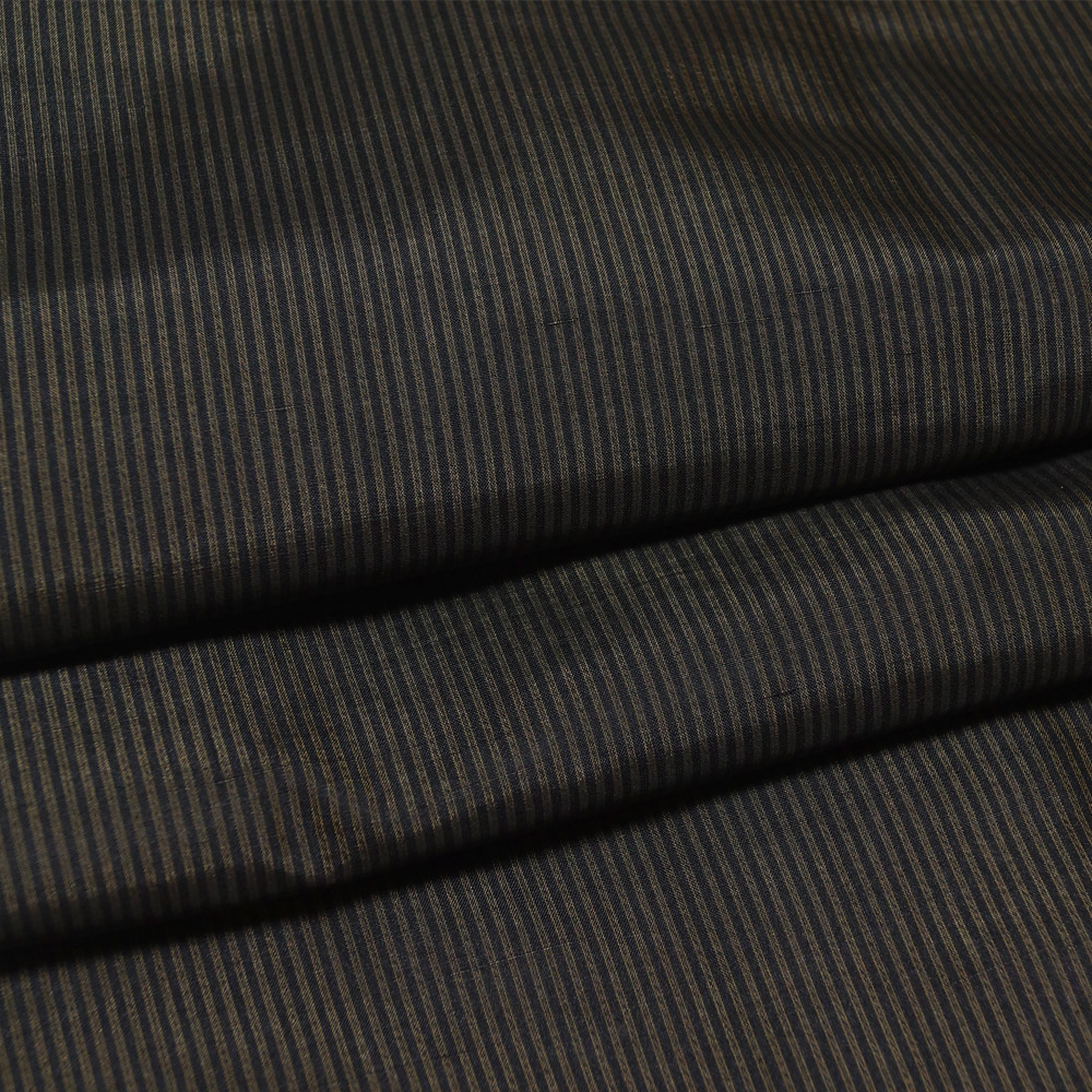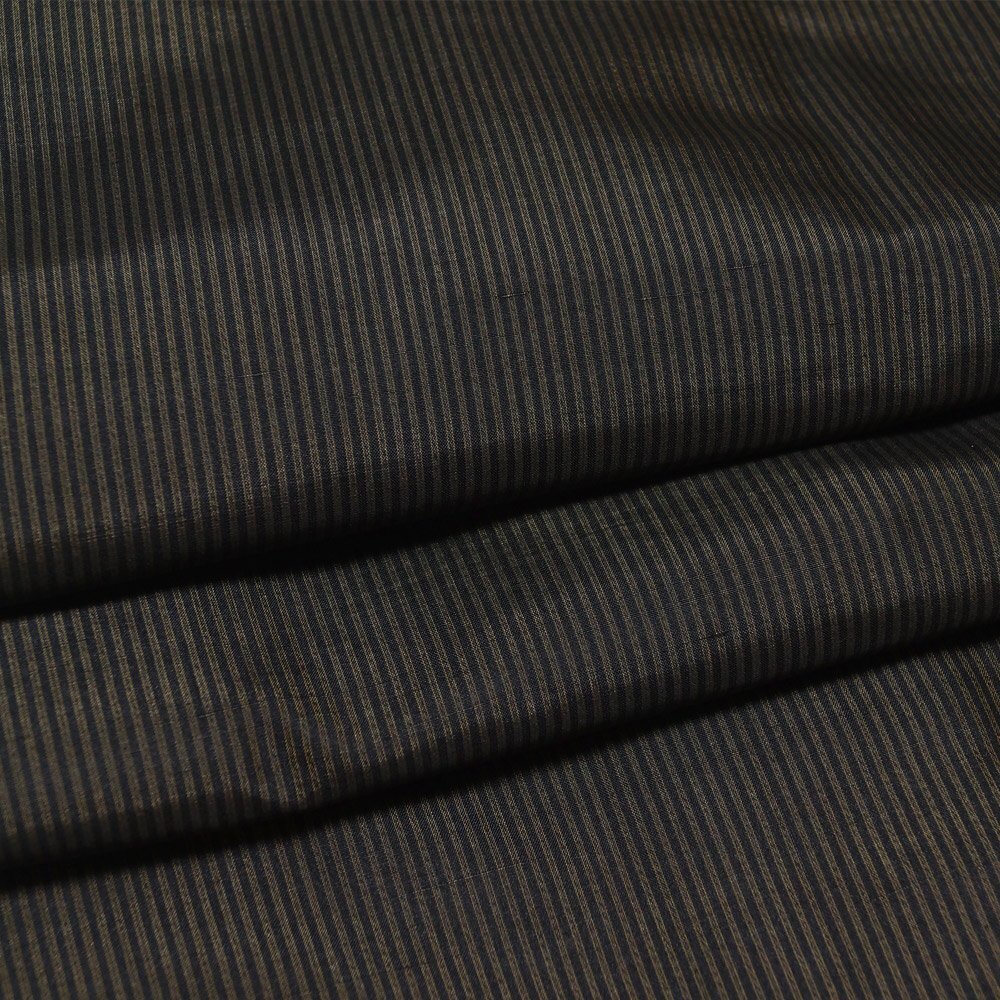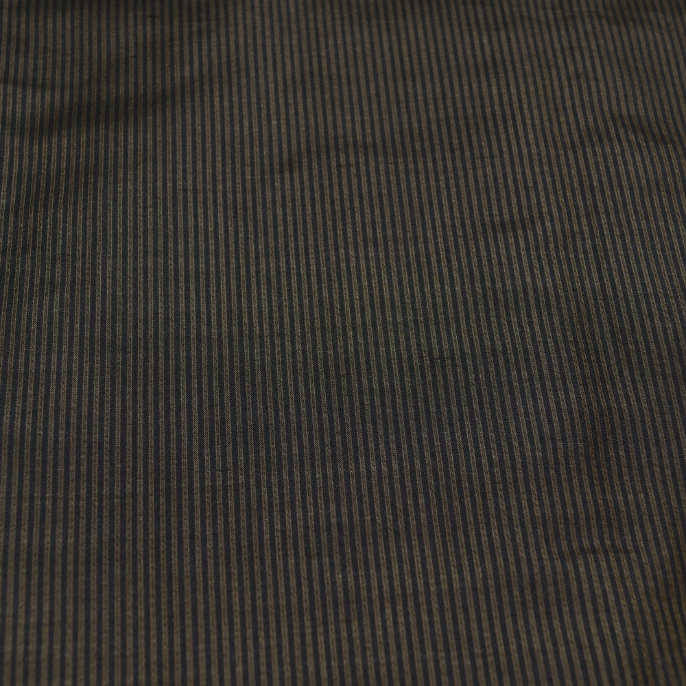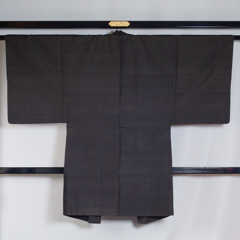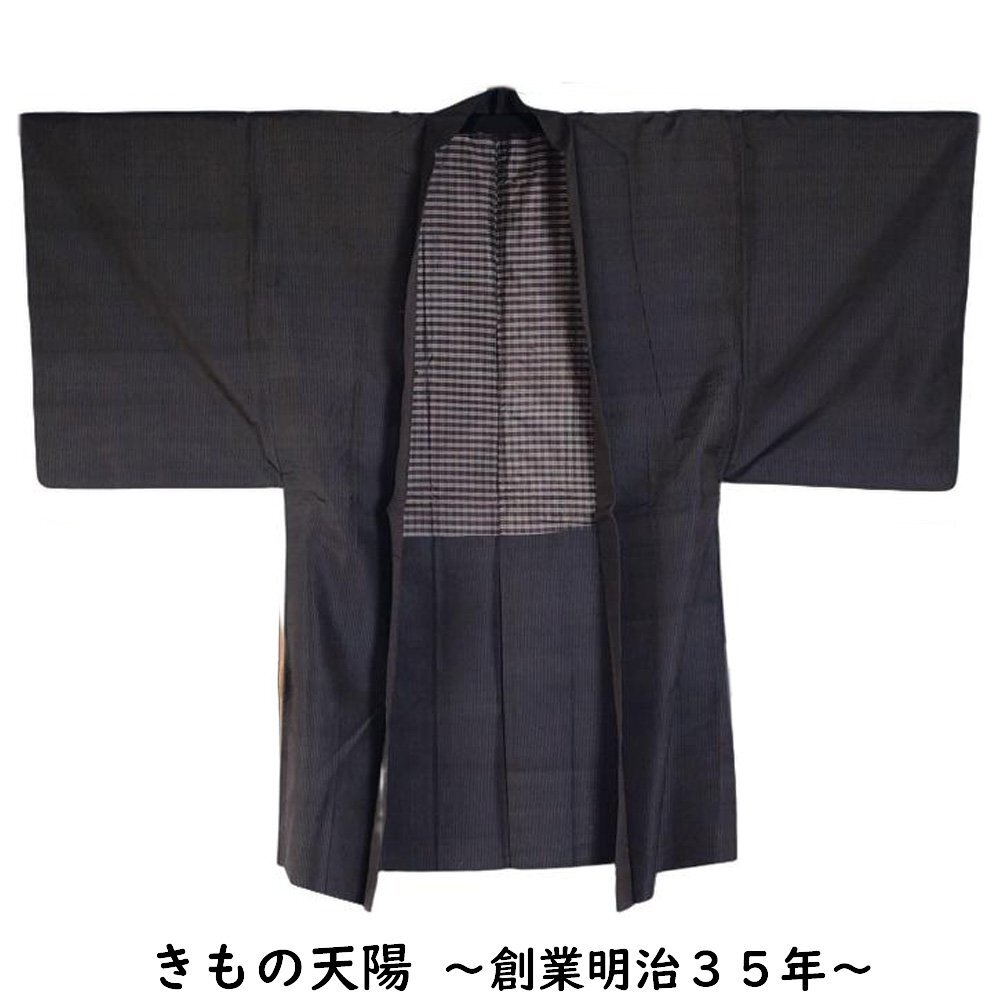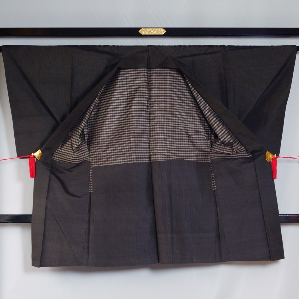 商品 説明 | 織節のあるしっとりとした黒色系の地に藍海松茶色系の縞模様が織られた羽織 単品です。羽裏は格子模様です。 羽織紐は付いておりません。 |