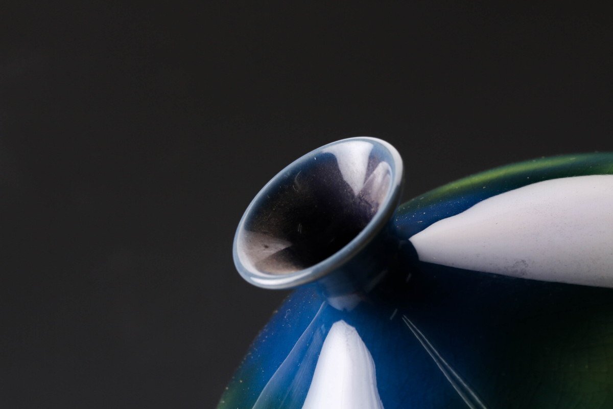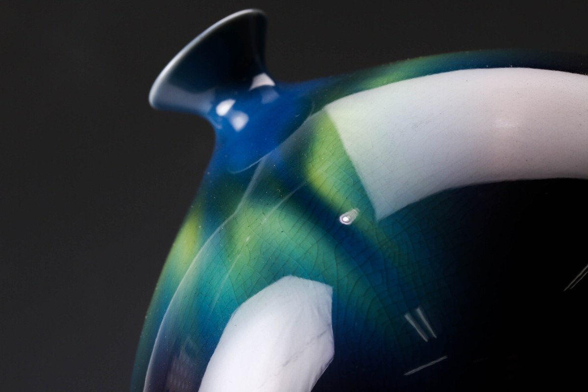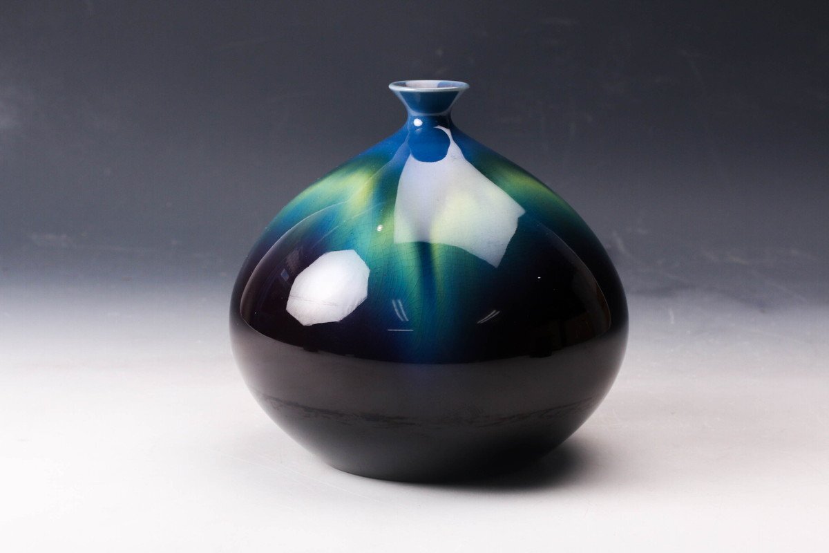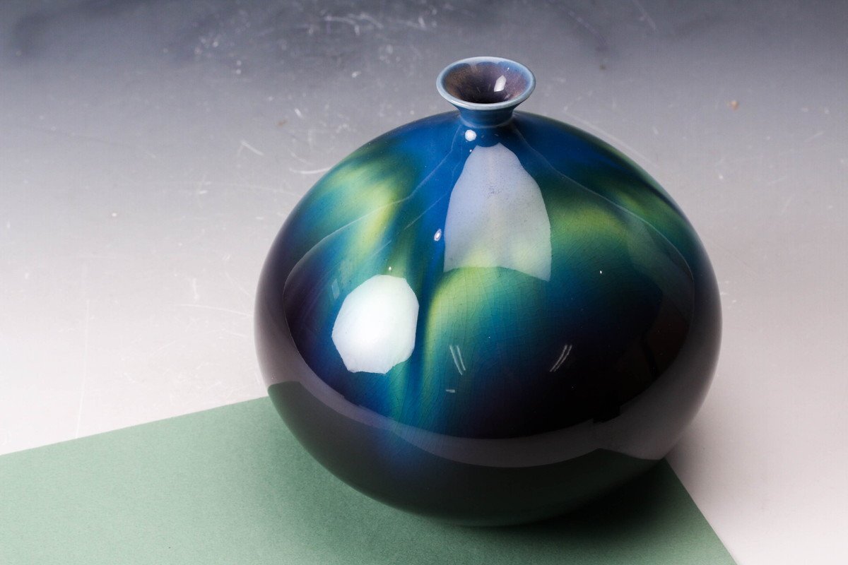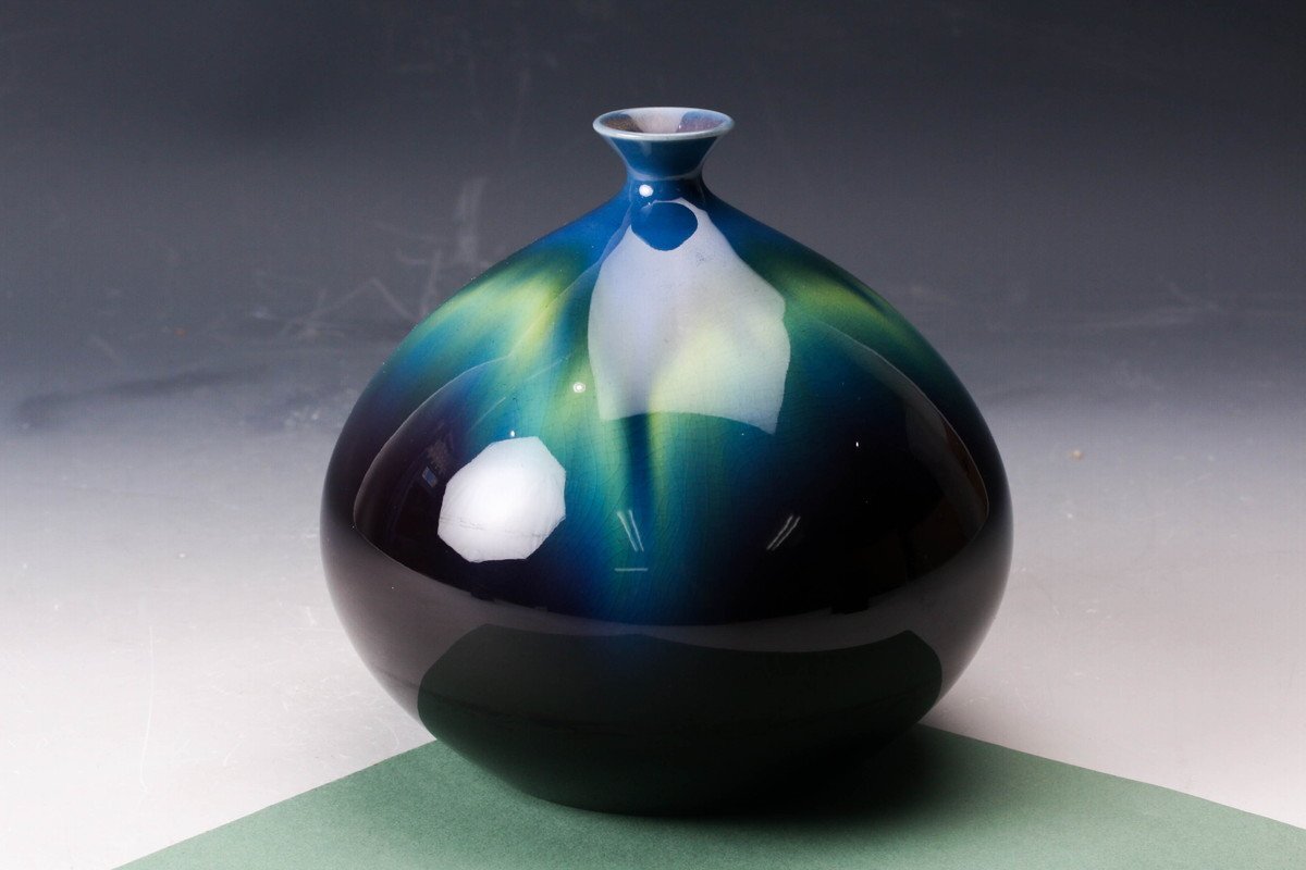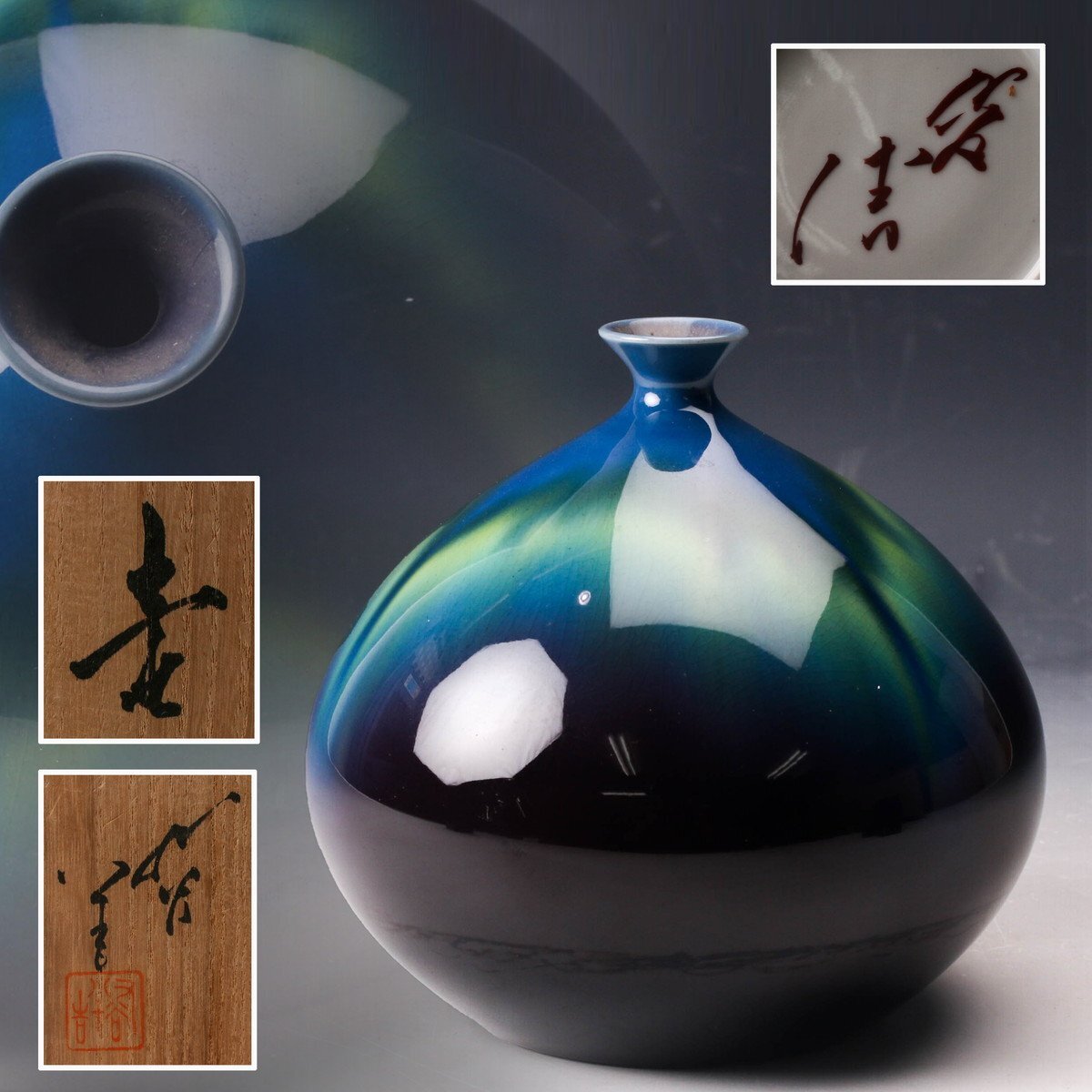 【佳香】人間国宝 三代 徳田八十吉(正彦) 碧彩釉壷 共箱 共布 栞 本物保証