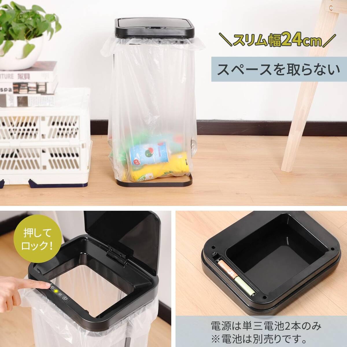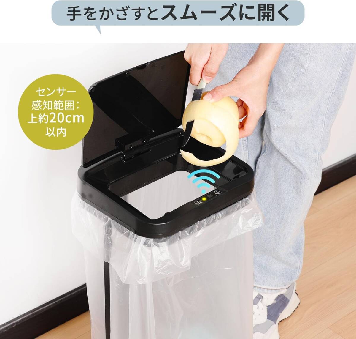 ◆自動センサー開閉だから、両手がふさがっていてもラクにゴミ捨てられ、不要な接触を避けられるから、キッチン・洗面所・オフィスなどでも衛生的です。