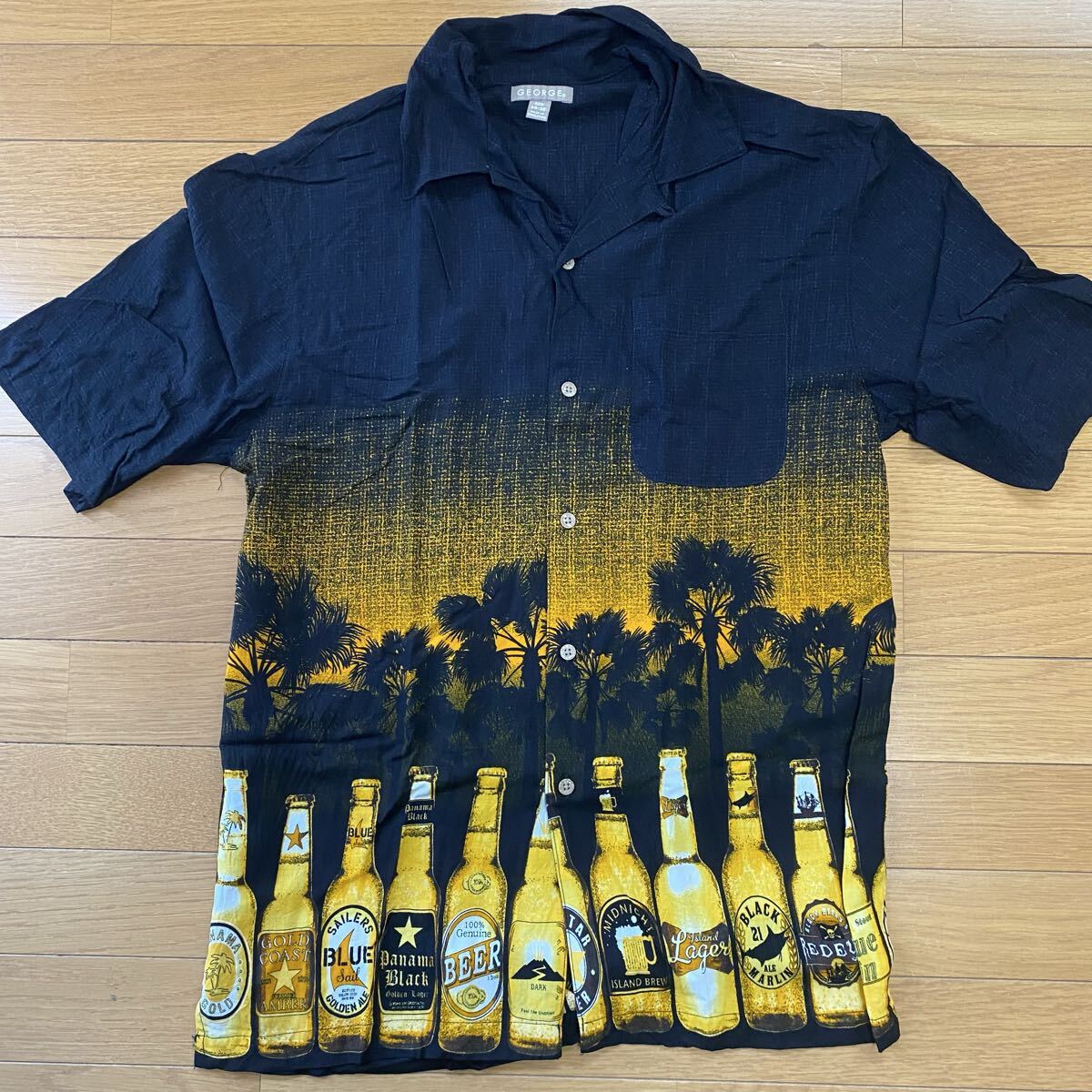 George ジョージ アロハシャツ レーヨン ブラック 総柄 瓶ビール 半袖 夏物 海外古着 メンズ