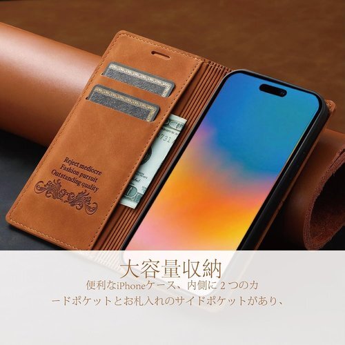 「大容量収納」カードポッドがついていて収納力があり。交通系のICカードを入れておくのに便利です。アイフォン 15promax 用 手帳型ケースの内側にはカード入れのポケットが付くため、重要な連絡先の名刺やクレジットカード十IDカードの収納に使用し、外出時にこのケースを携帯するだけで日常生活を便利になる。なお、厚みのあるカード収納や、収納数により厚みがあるとフタが閉まらない事がございます。改てご承知ください。