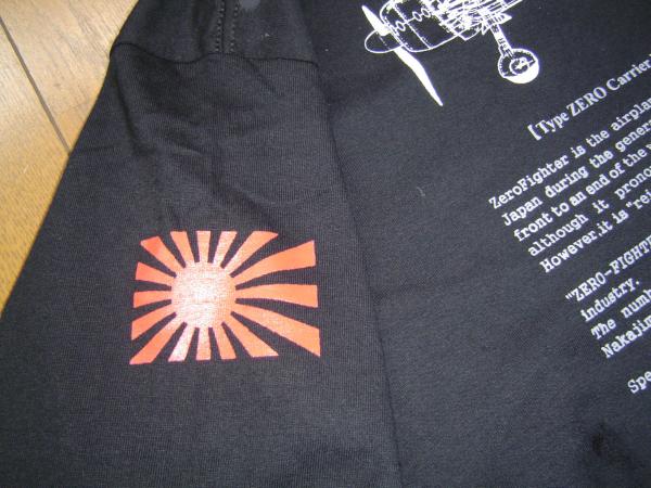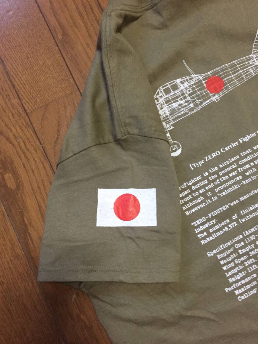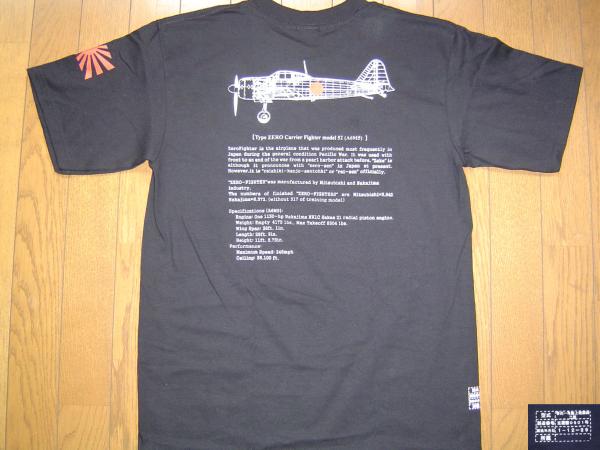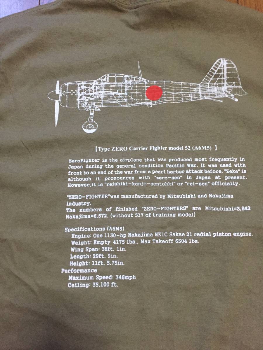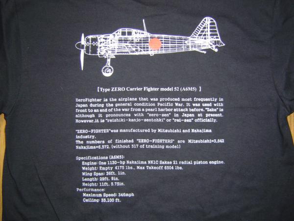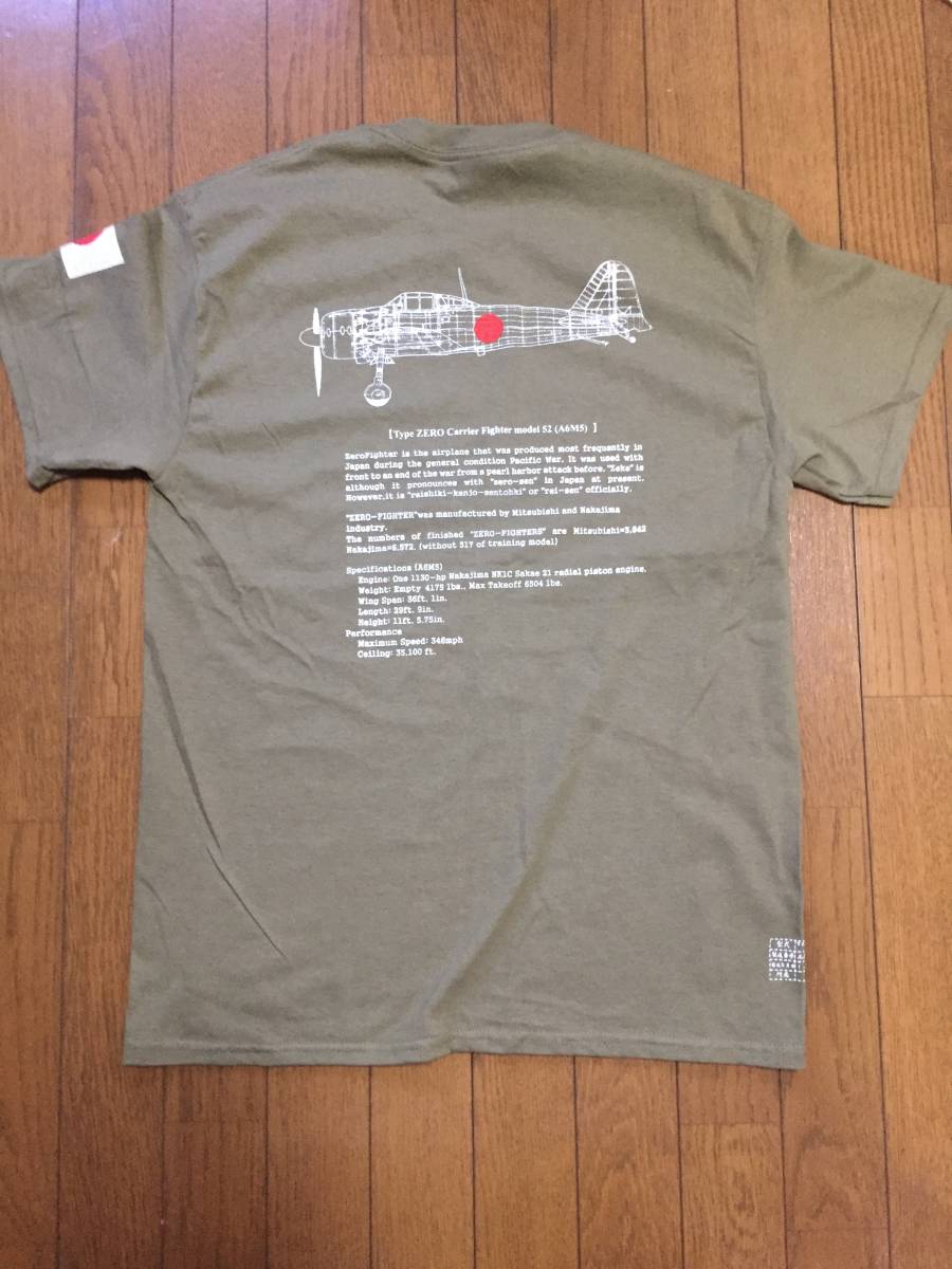 フロント面もしくはバックに零戦精密図とそのプロフィール(英文)をプリントします。左袖には海軍旗、右裾には機体番号をプリントします。凄くCOOLな作品に仕上がってますので海軍ファン、レシプロ戦闘機ファンの方などに是非どうぞ。