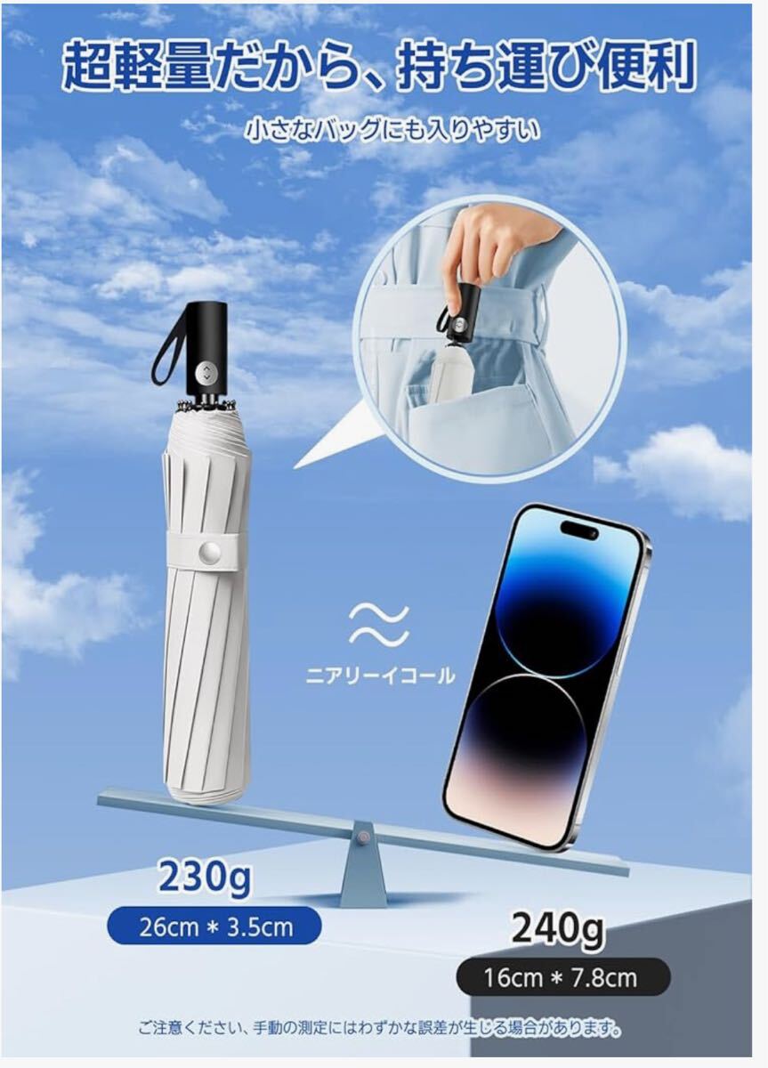 【超軽量・コンパクト折り畳み日傘】カーボンファイバーとアルミ合金を使用した、軽くて丈夫な折り畳み日傘です。最適化された構造により、通常より軽量化されており、重さはわずか126g。折り畳むとたったの3.5cmと非常にスリムなサイズなので、バッグに収納してもかさばりません。毎日通学や通勤などで持ち歩いても負担にならず、夏フェスやスポーツ観戦、ライブ、野外イベント、キャンプ、登山、旅行など、屋外での活動にぴったりな暑さ対策グッズです。