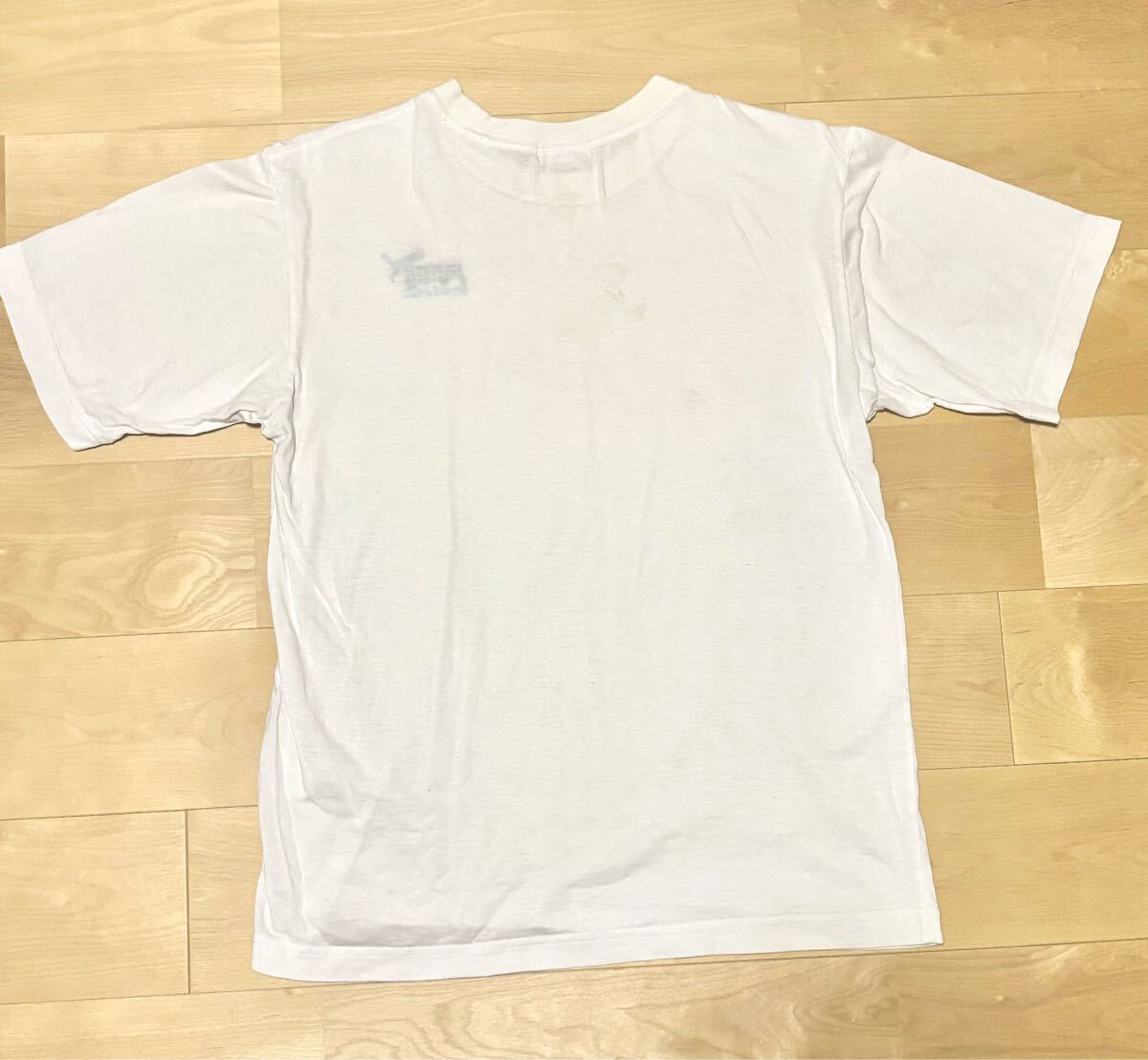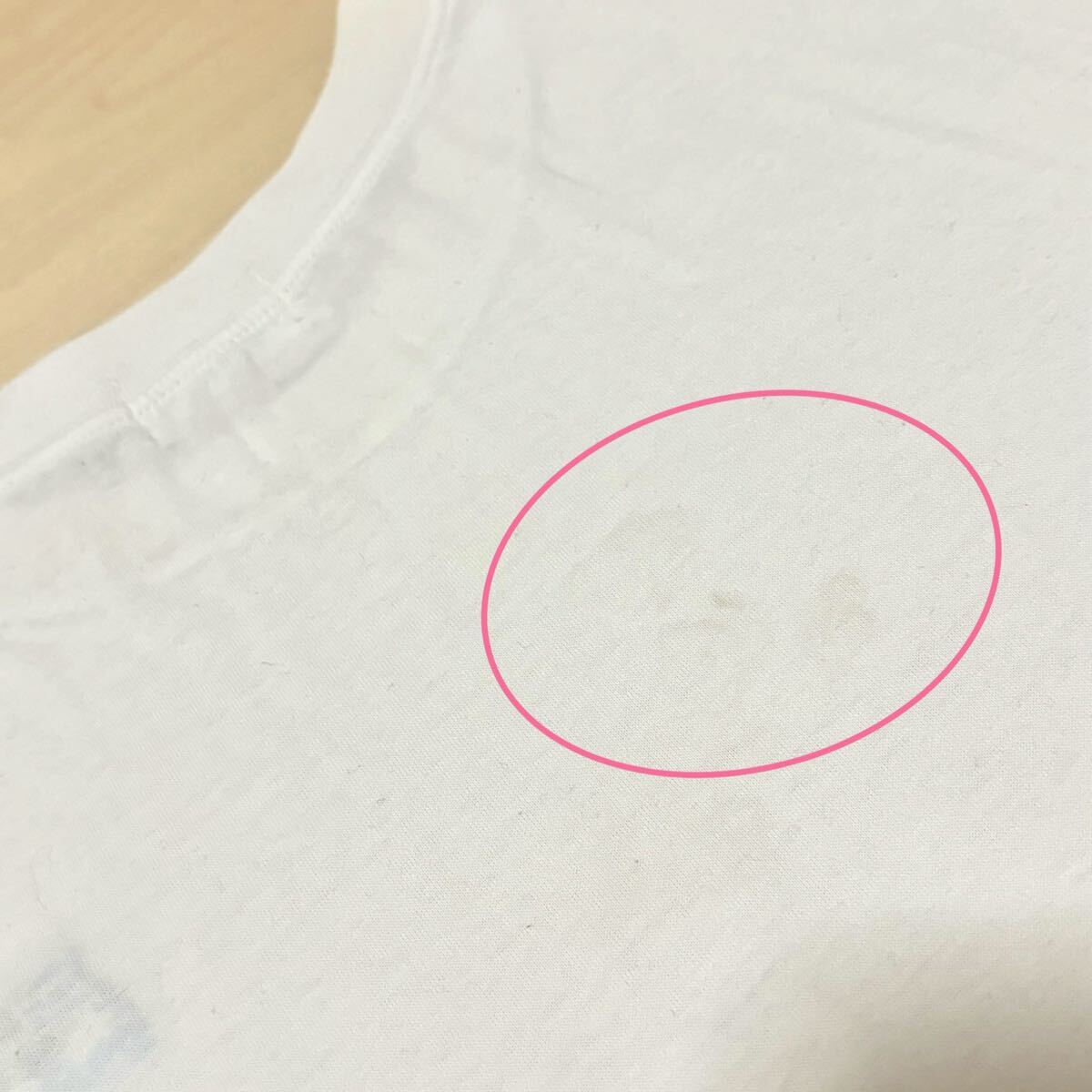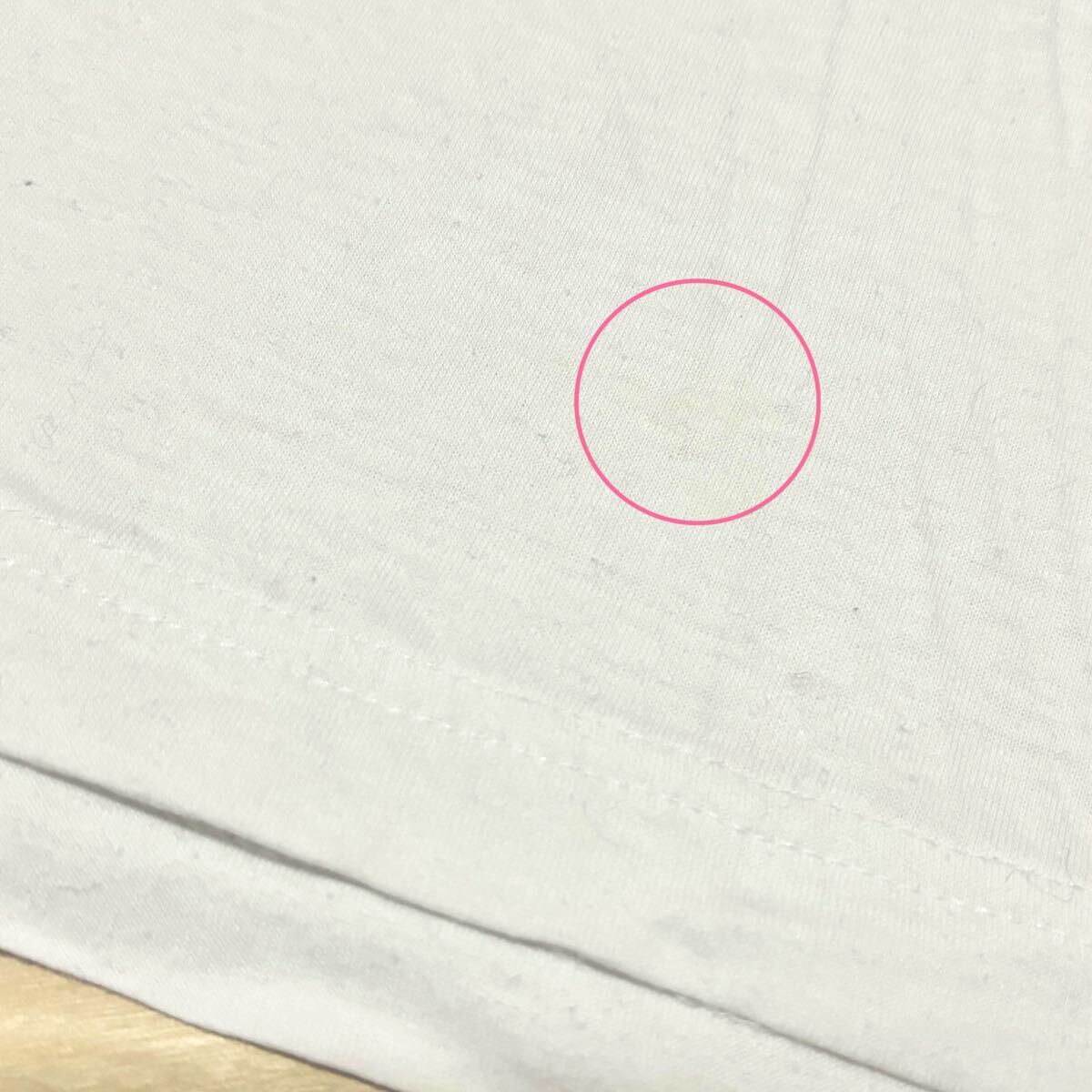 生地表面の使用感、前身頃の裾あたり指摘箇所にシミ、衿ぐりの黄ばみ、背中に黒っぽい擦れたような汚れがあります。