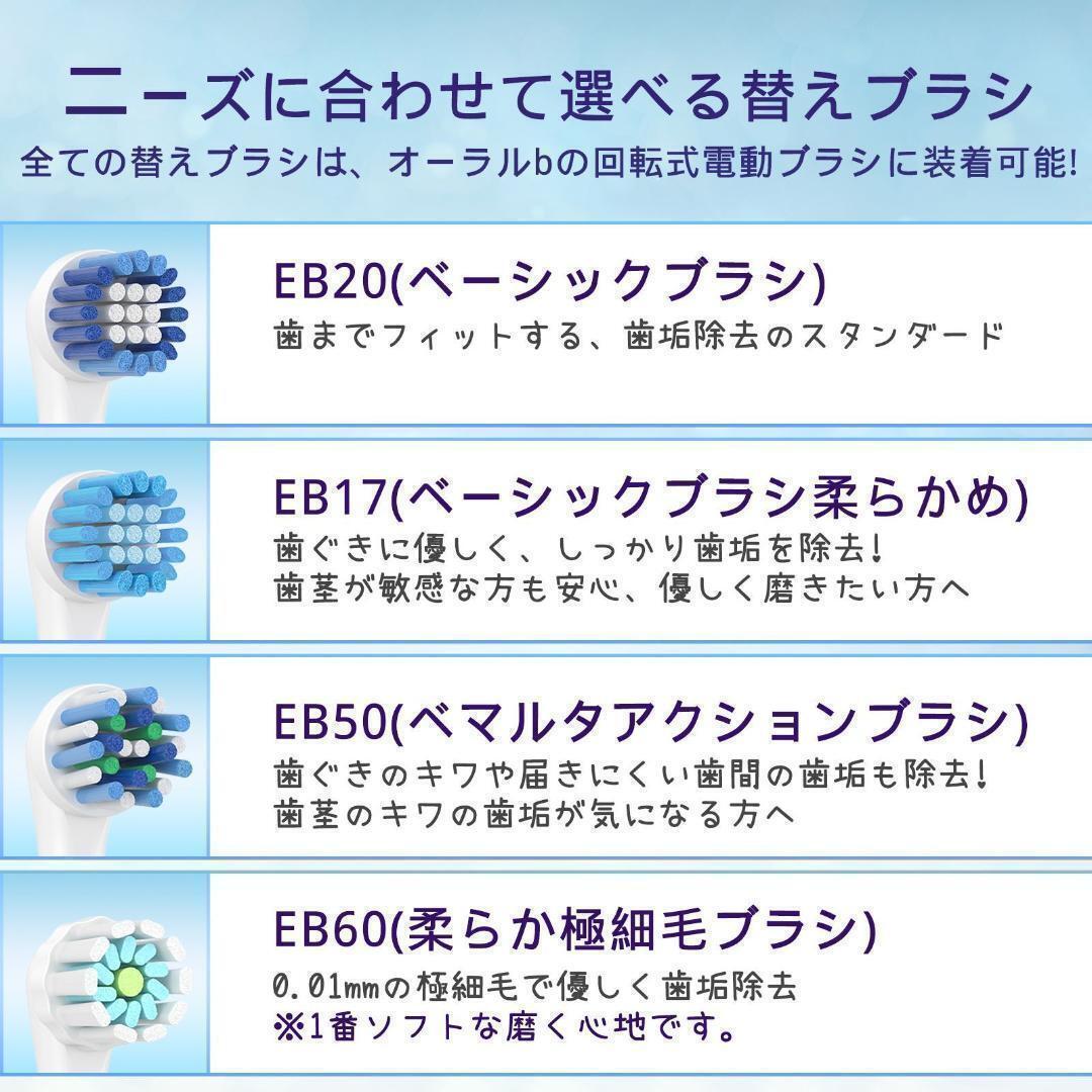 1.16本入り(4種各4本入):4*EB50(マルチアクションブラシ)、4*EB60(やわらか極細毛ブラシ)、 4*EB20(ベーシックブラシ)、4*EB17(柔らかい ベーシックブラシ)。 適用機種:ブラウン オーラルbの回転式電動歯ブラシ全機種に装着可能。
