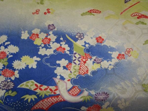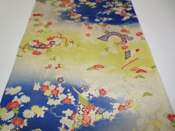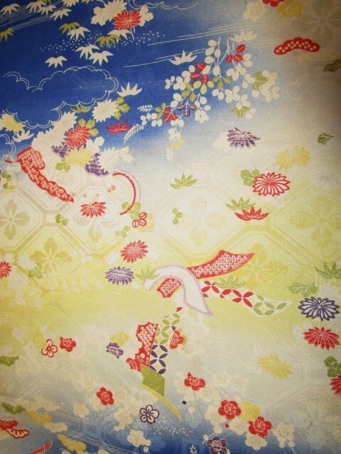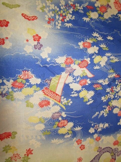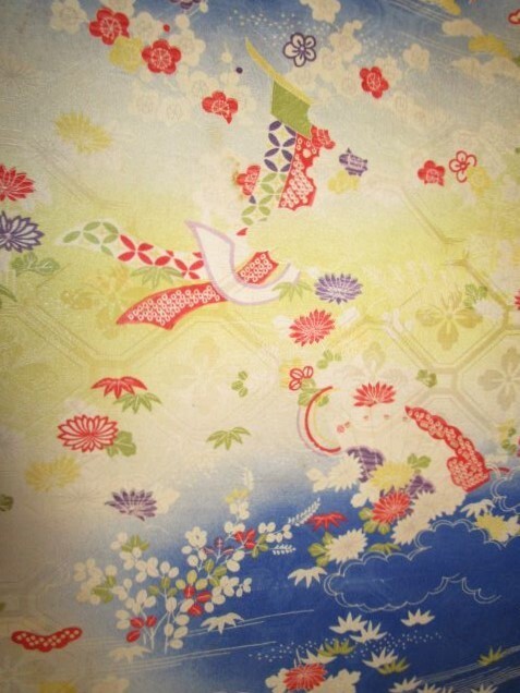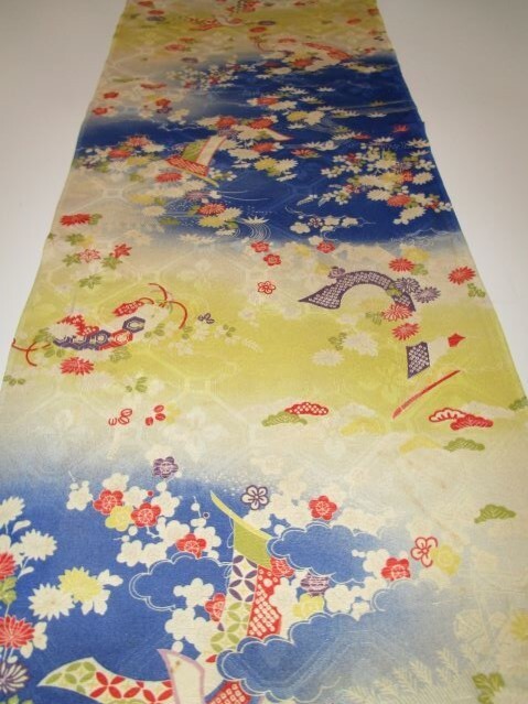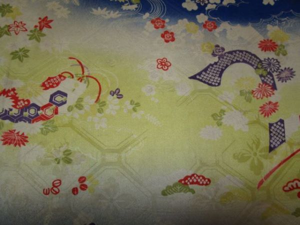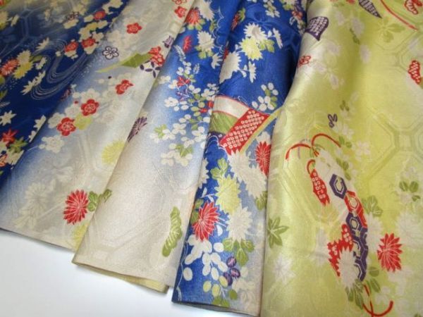 E-114★黄青*扇*菊*萩*松竹梅*亀甲柄*綸子*古布はぎれ★文化人形/一閑張り/吊るし雛/市松人形アンティーク/ちりめん細工