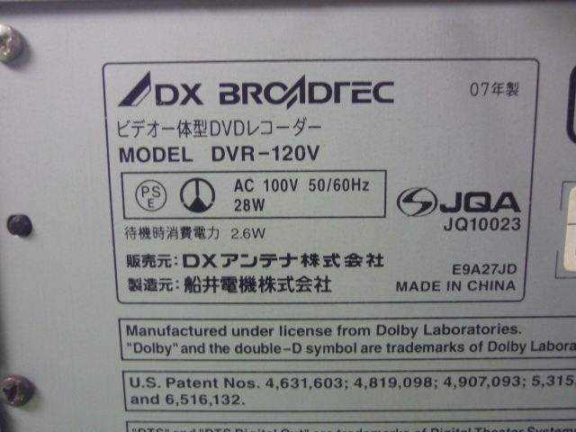 ジャンク/DX BROADTEC DVR-120V('07)/VHS_DVDレコーダー(管7062903)