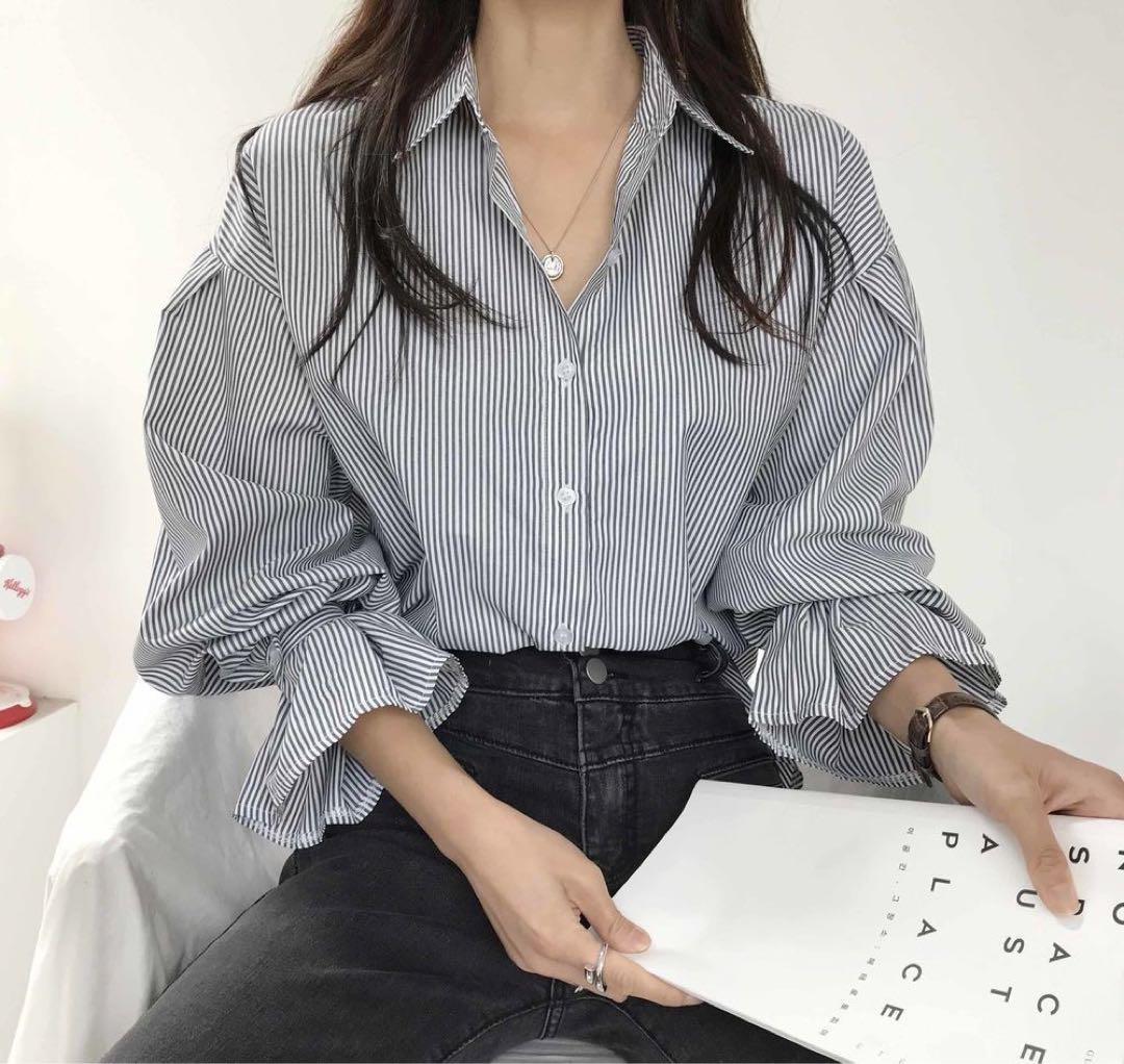 長袖 襟つき ストライプ 前開き バルーンスリーブ フリル
