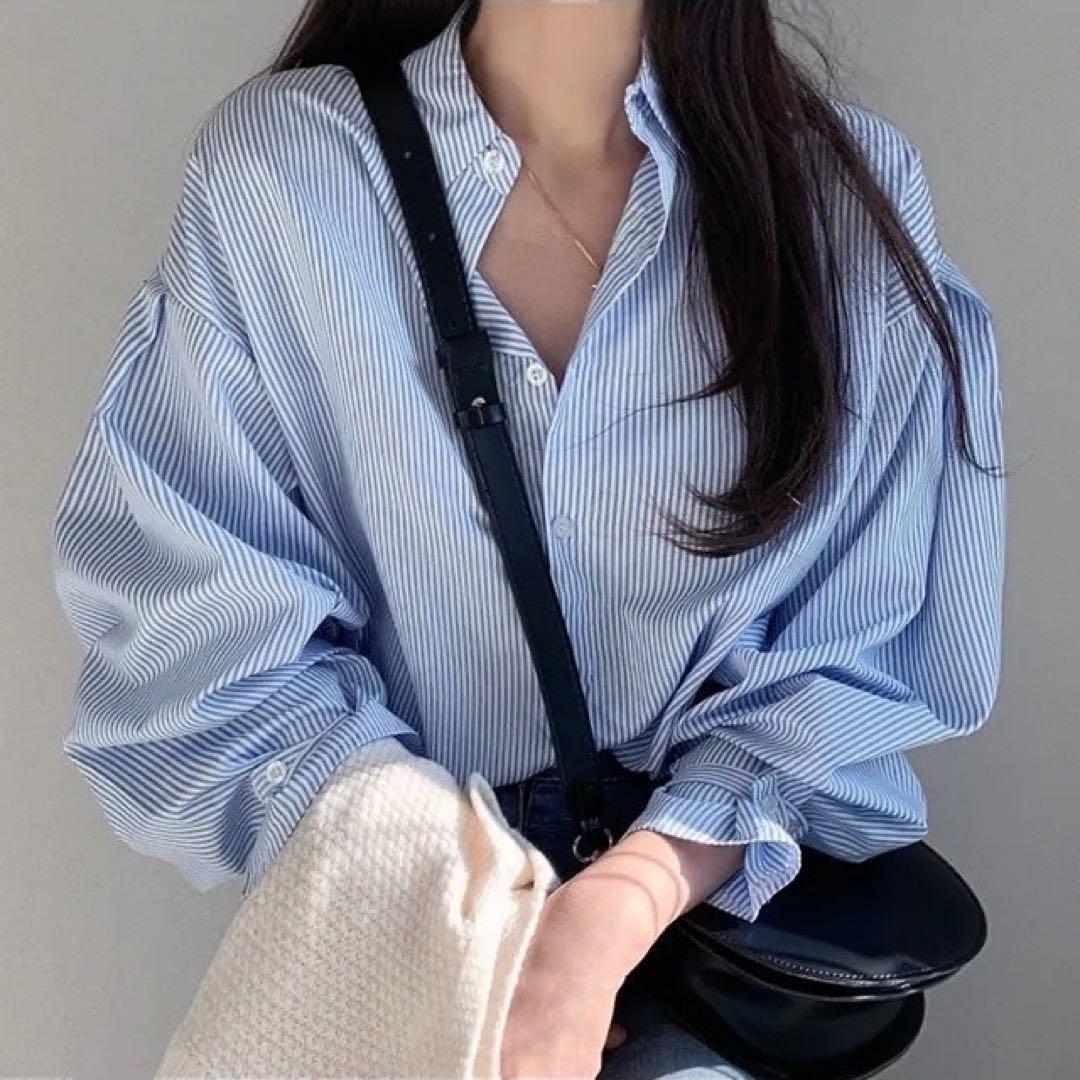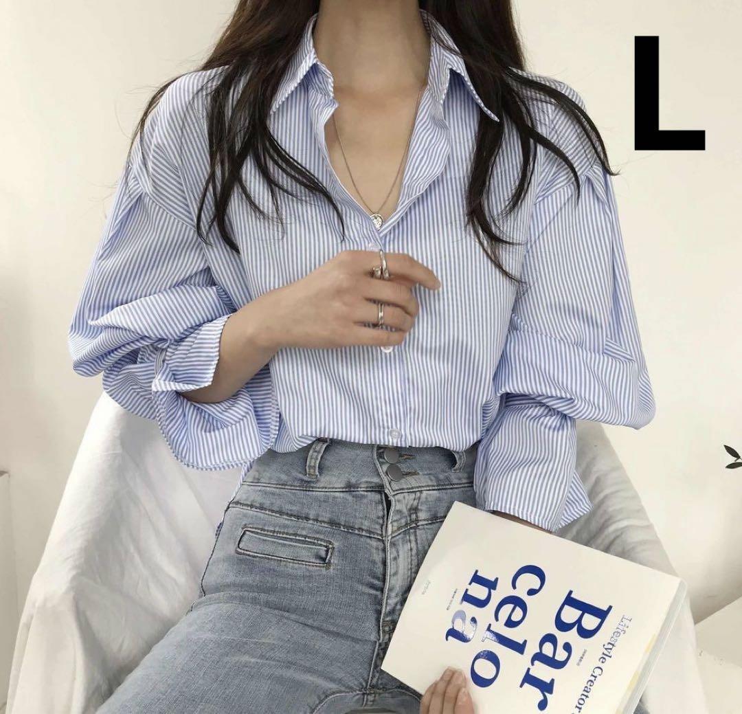 ゆったりしたシルエットとストライプ柄で華奢魅せ効果を狙えるオーバーサイズシャツ。