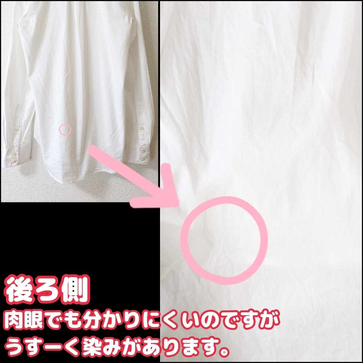 背中に肉眼でも分かりにくい程度のうすーい染みがあります。ほとんど分かりませんが、気になる方はご遠慮下さい。最後の画像にてご確認くださいませ。その他は使用感程度のしわよりあります。