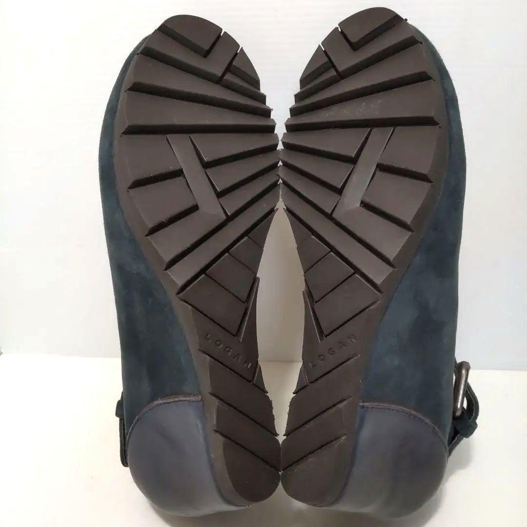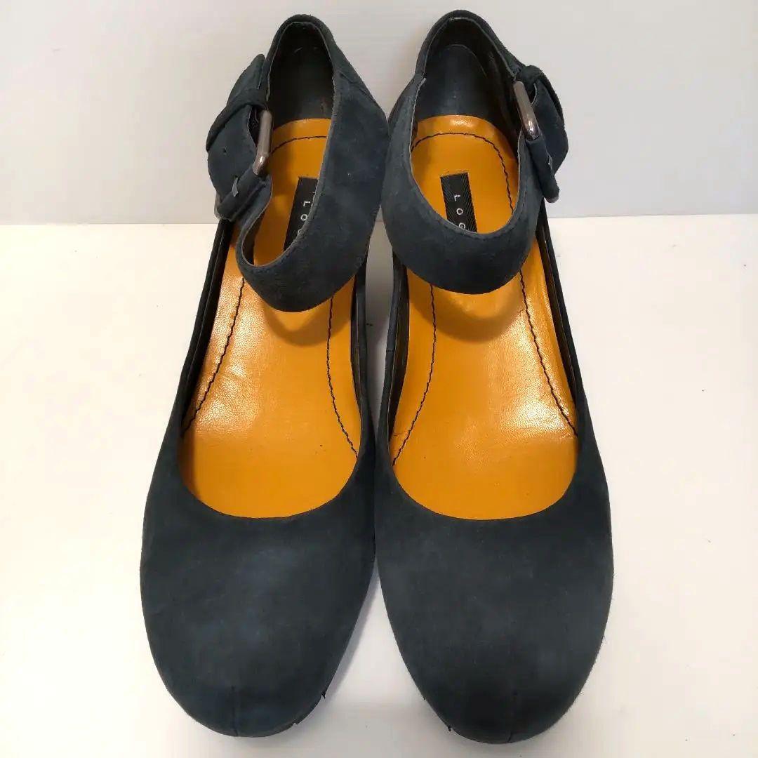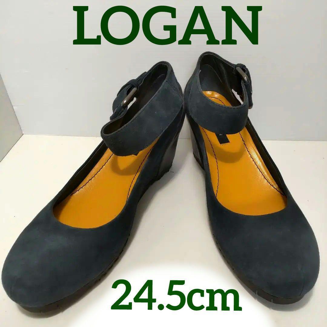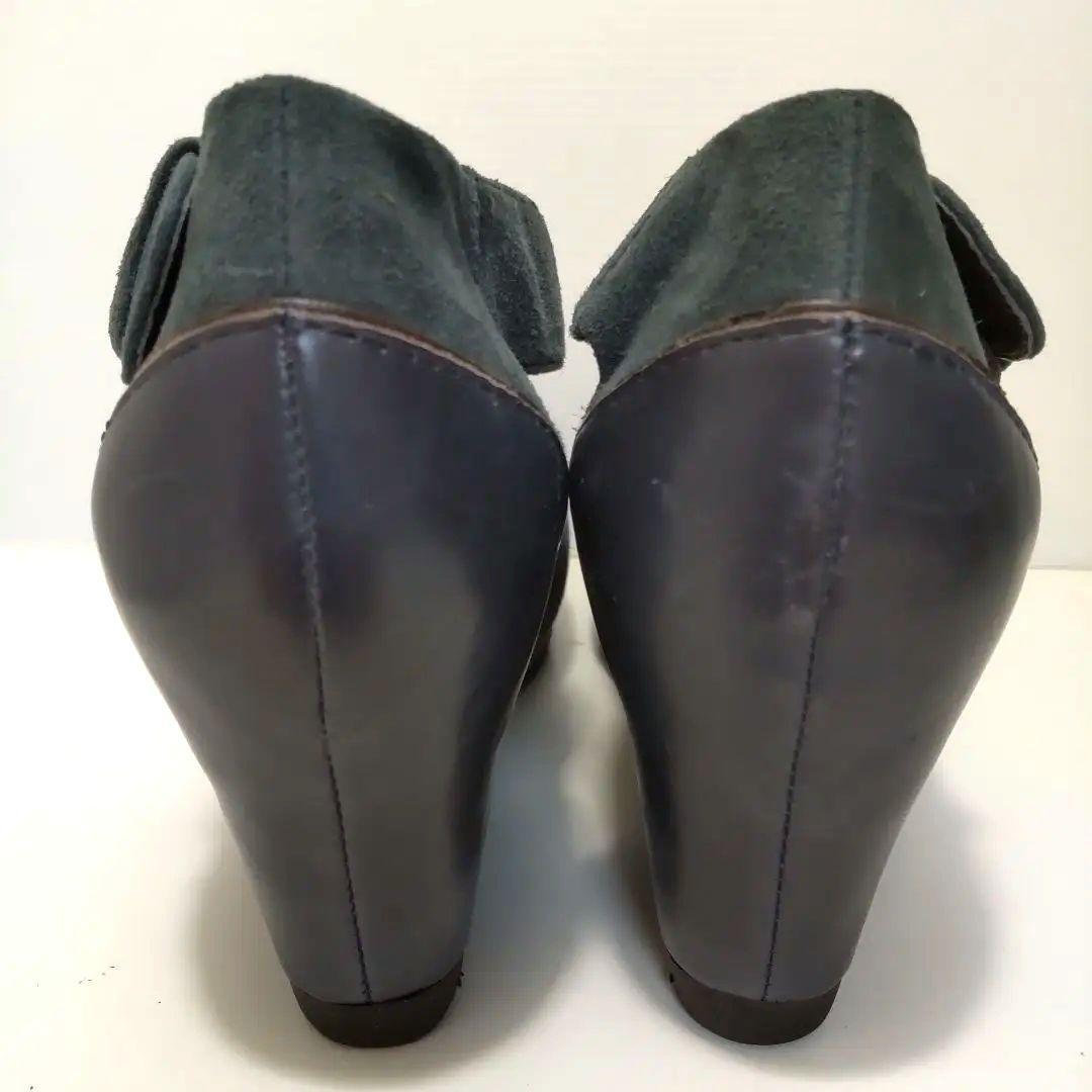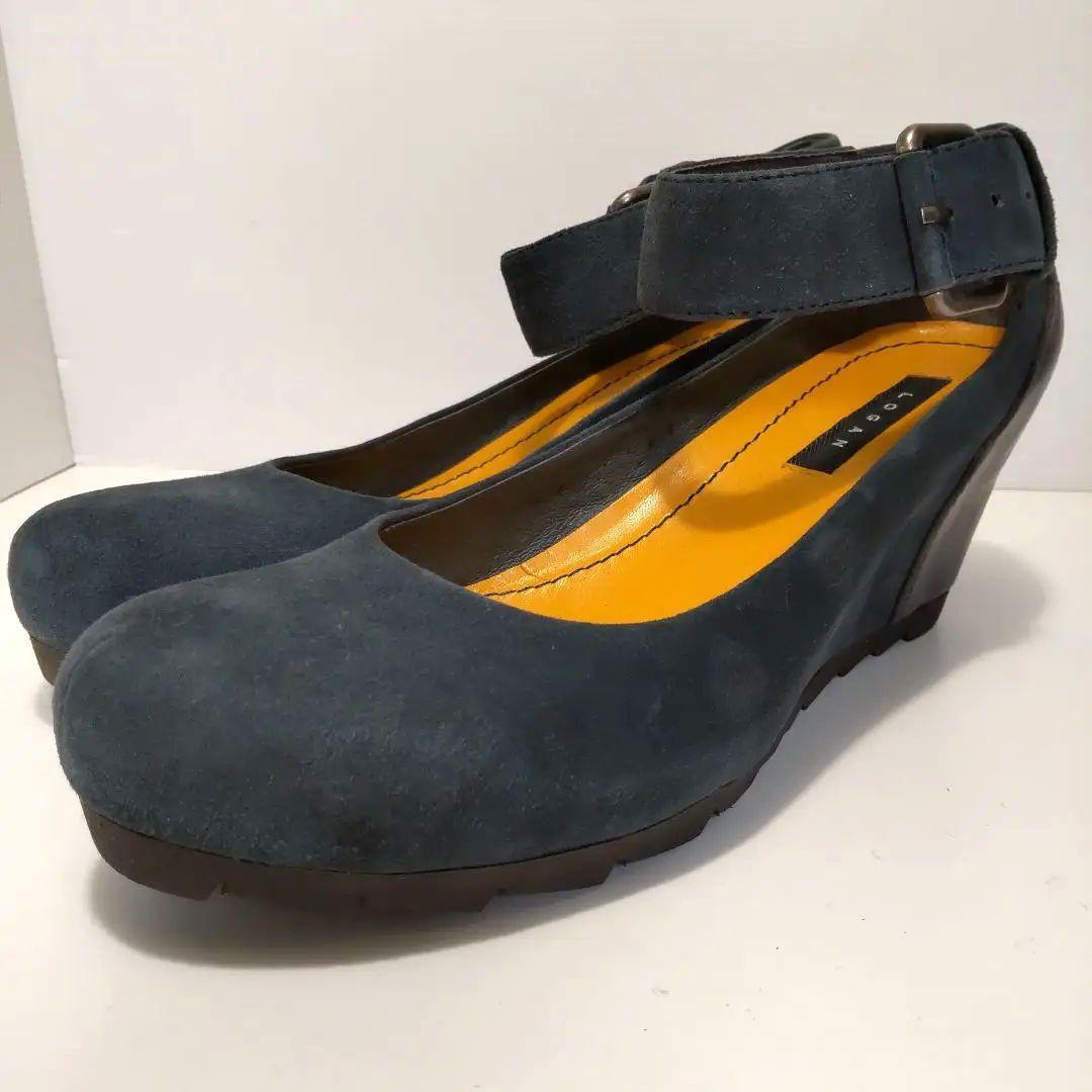 LOGANのダークグリーンのスエードレザーアンクルストラップ付きウェッジヒールパンプス。