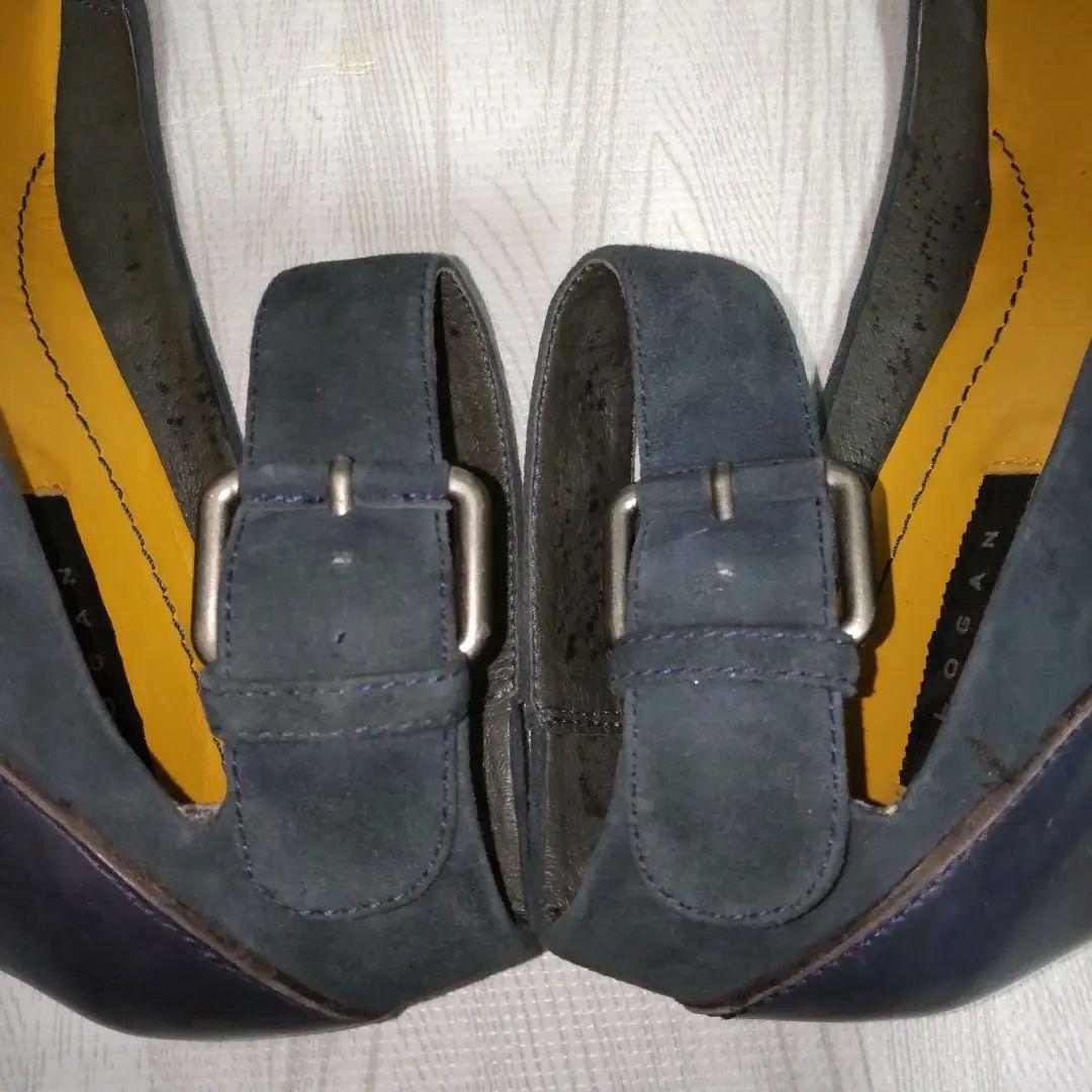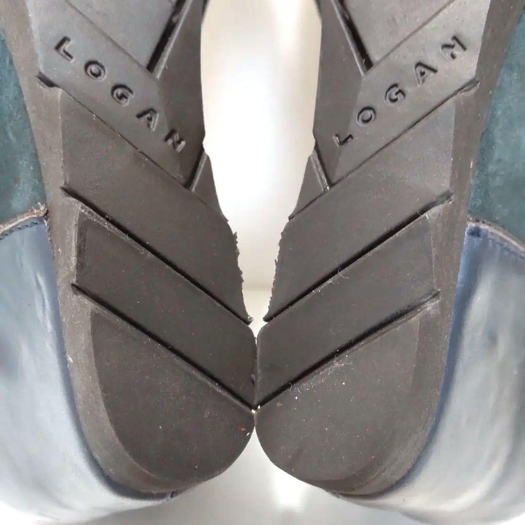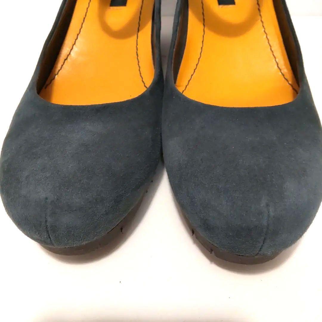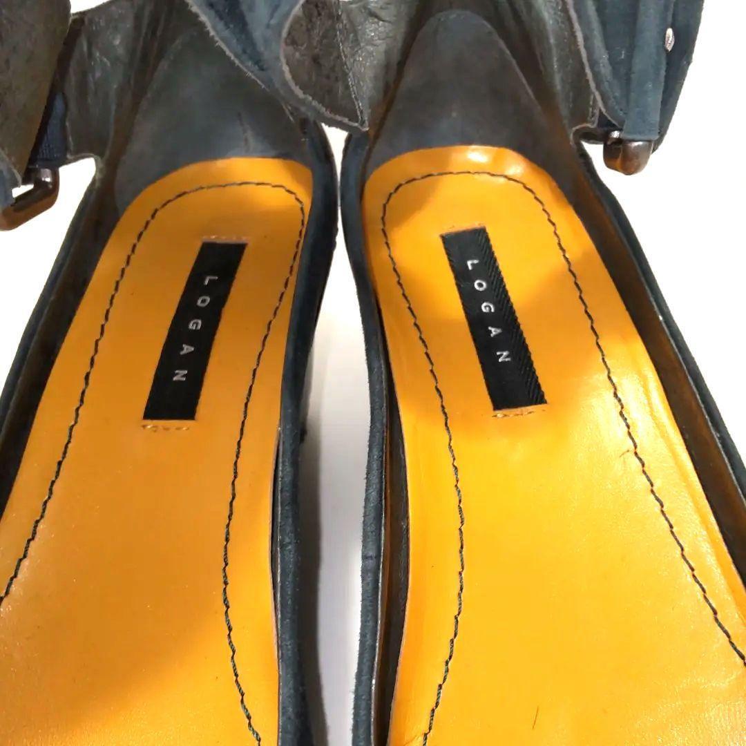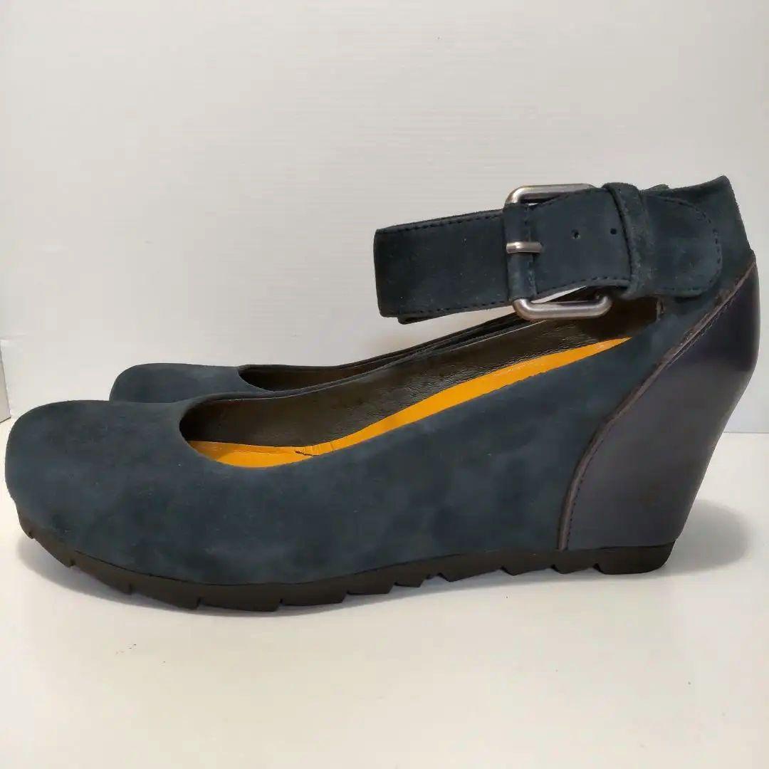 LOGANのダークグリーンのスエードレザーアンクルストラップ付きウェッジヒールパンプス。