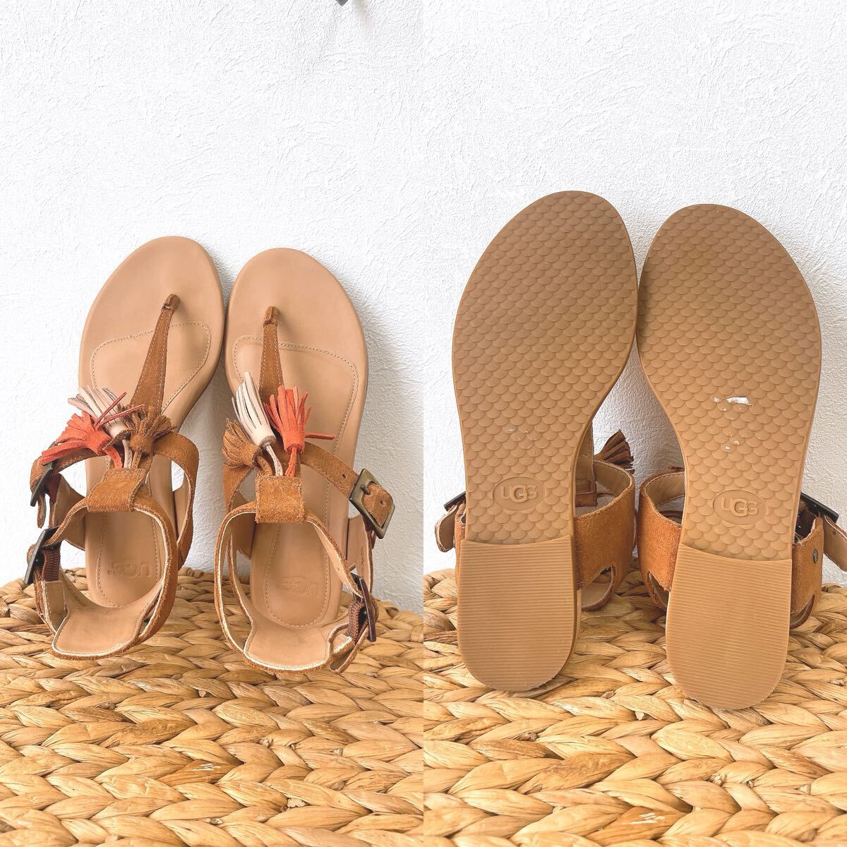 リッチなスエードアッパー、カラフルなフリンジタッセルとメタルバックル、UGGロゴリベット。