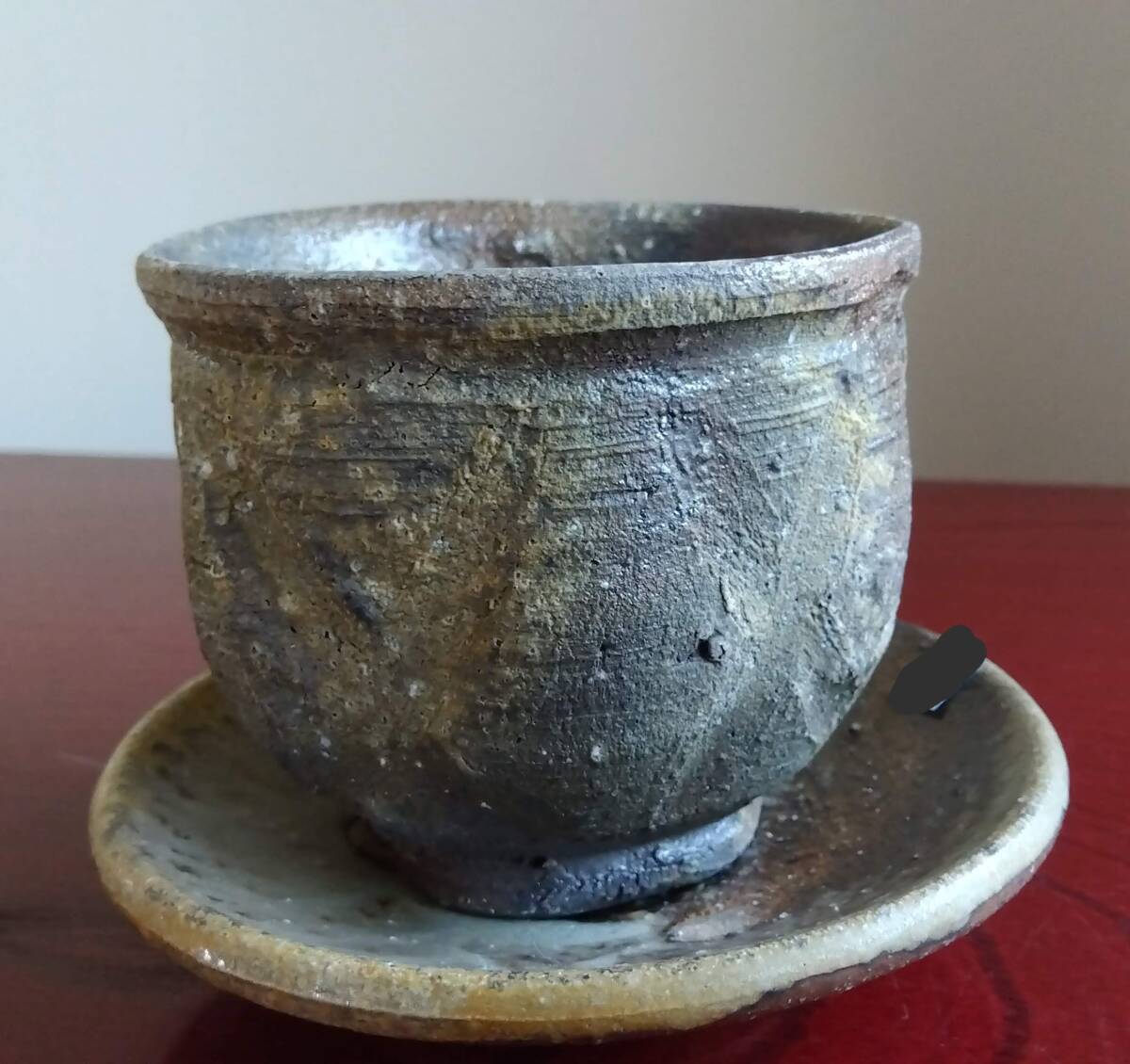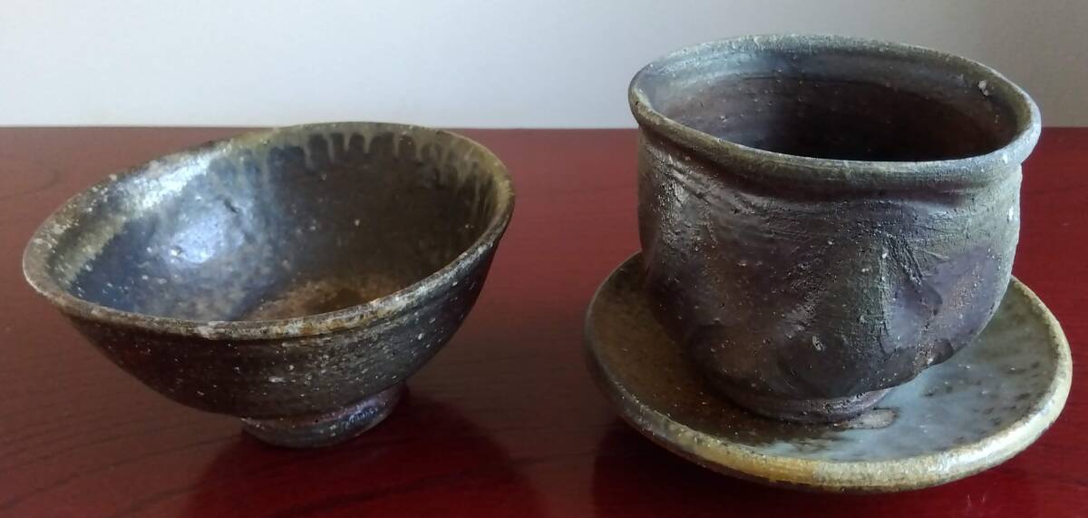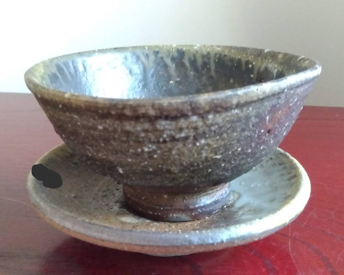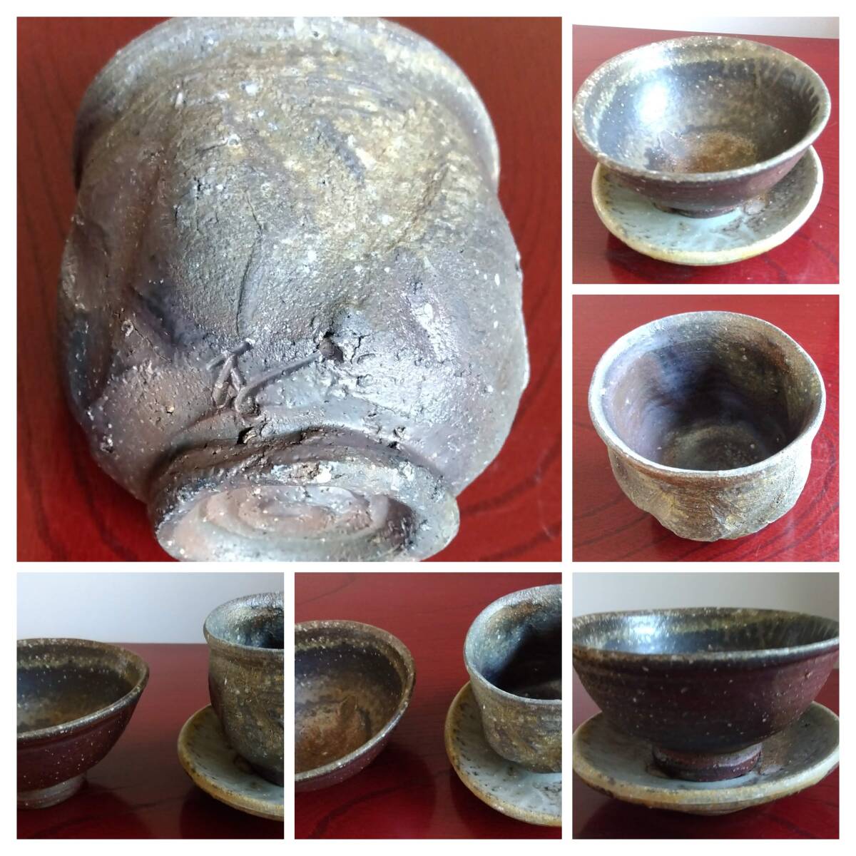 越前焼の名工 白越不朝(塩越窯)自然灰釉究極美の逸品ぐい呑み/湯呑2種及び茶托3点セット No:11