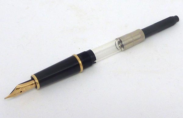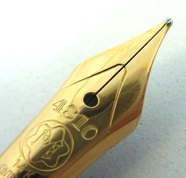 古いモデルかと思います。本体シールにはFとありますのでF(細字)になります。ペン先には14Kとあり全金(金色)ニブです。裏側は縦溝になりますので中~後期型のようです。