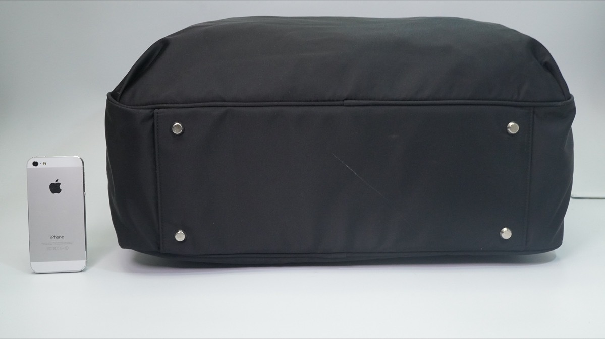 キズ・汚れ防止の底鋲タイプ、500mlペットボトルを立てて収納可能1泊旅行が可能なサイズ感です。