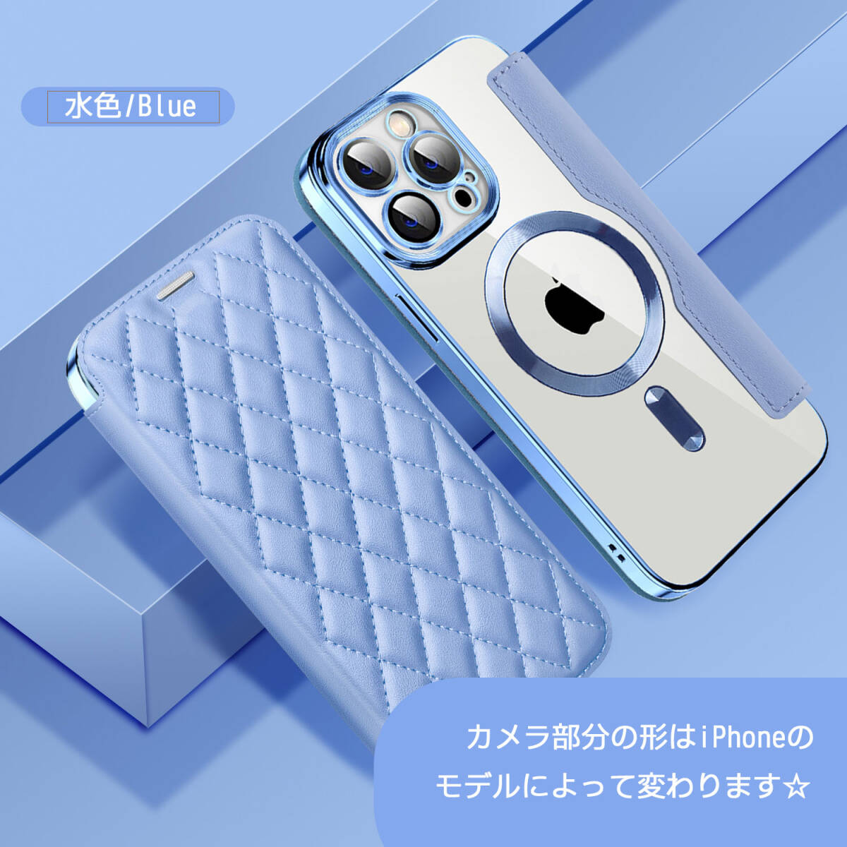 【iPhone 14用・ライトブルー】MagSafe対応 手帳型 スマホケース iPhone ケース クリア背面 ダイヤレザー カード収納3枚 耐衝撃 水色