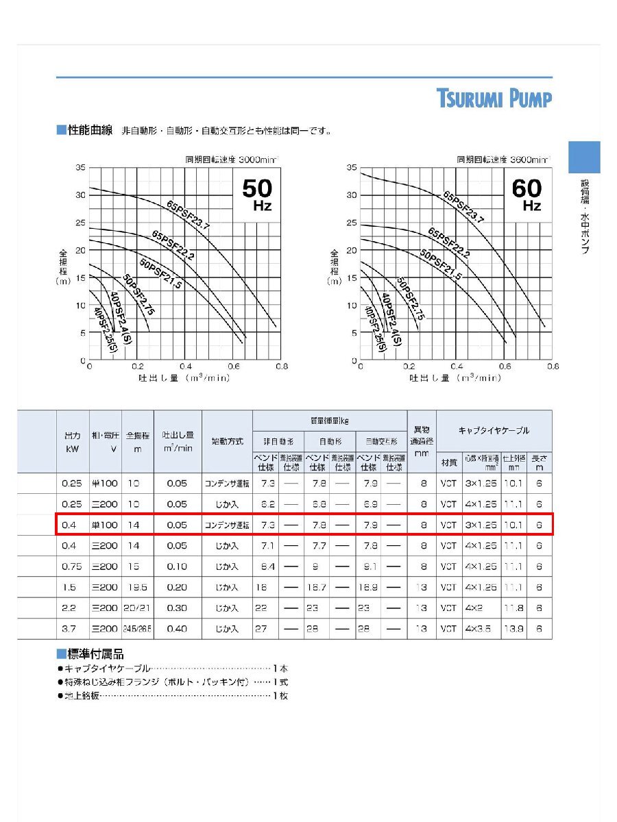 【代引不可】鶴見製作所 ツルミポンプ 水中うず巻ポンプ PSF型 バンクスシリーズ 自動交互形 口径40mm 60Hz 西日本用 単相100V 出力0.4kW