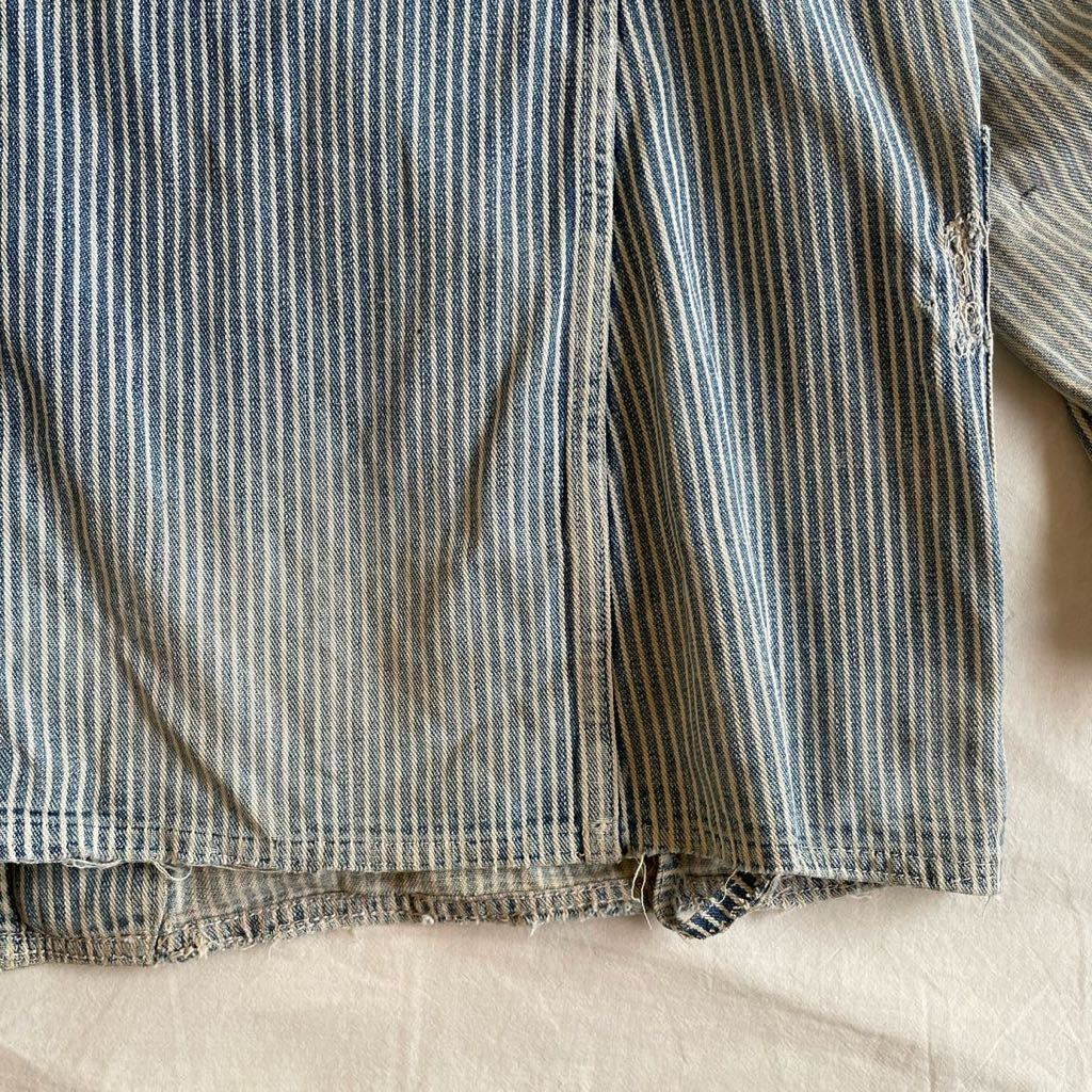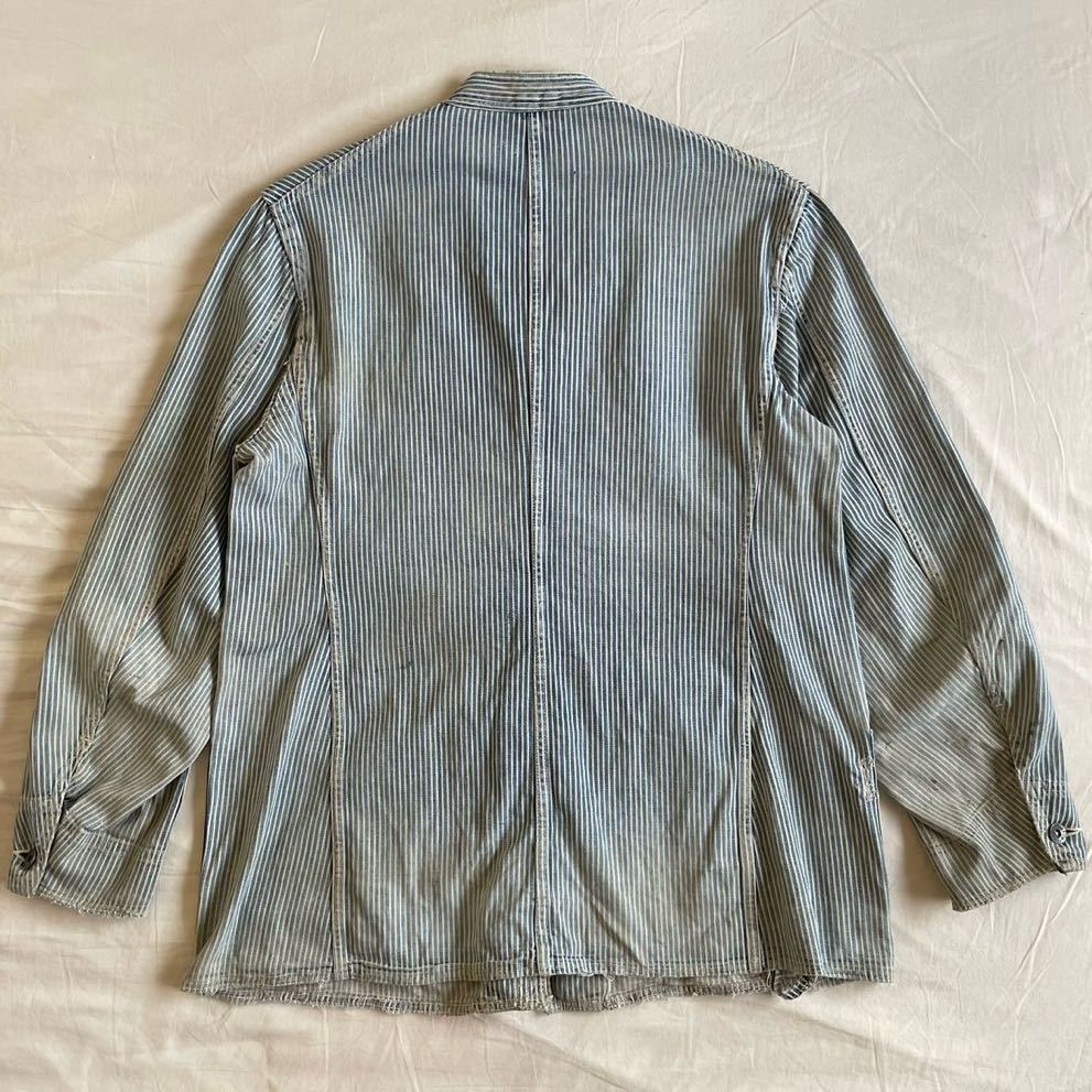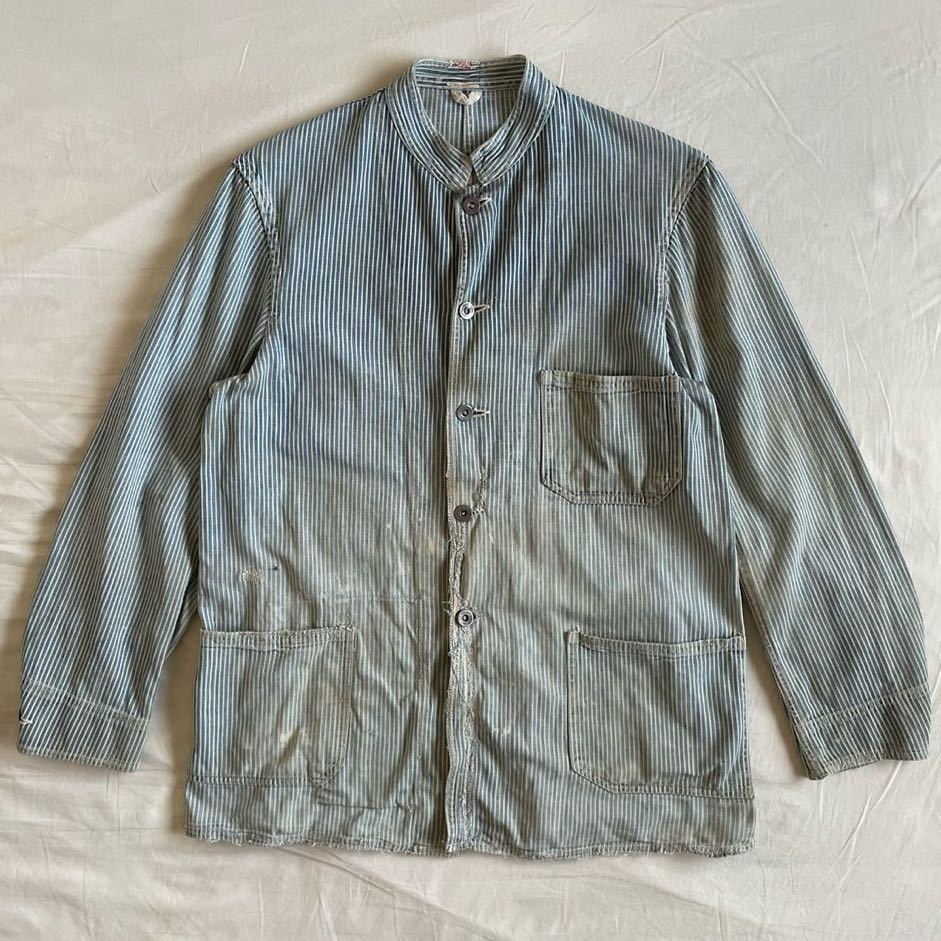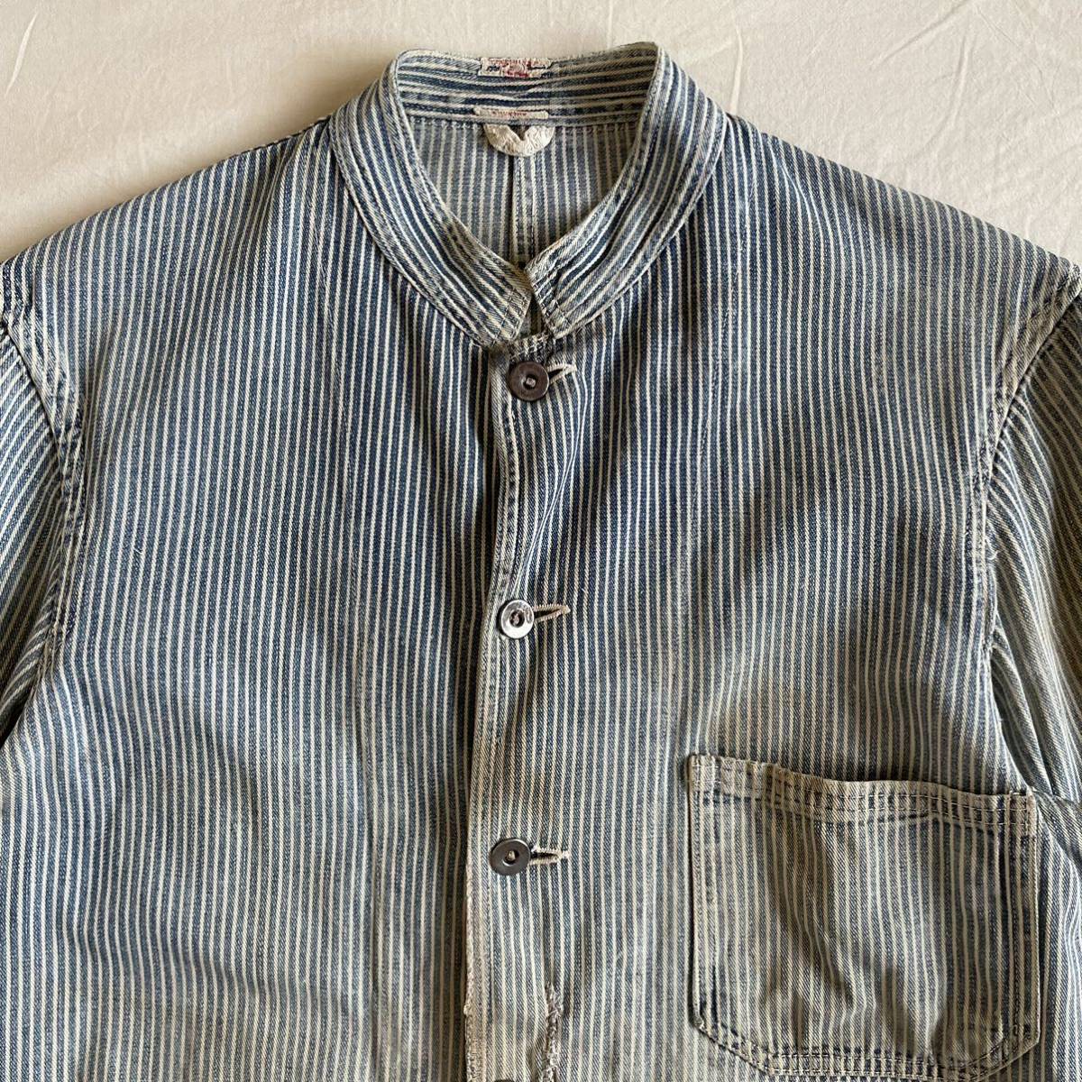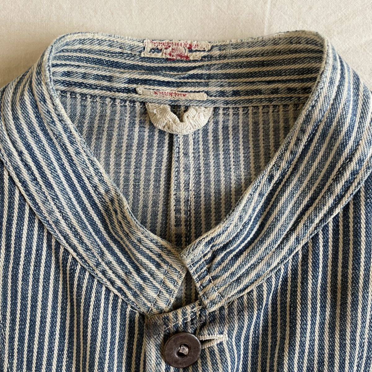 ヒッコリーストライプ生地でスタンドネック、メタル釦仕様とスペシャルな1枚。