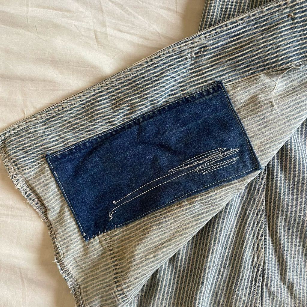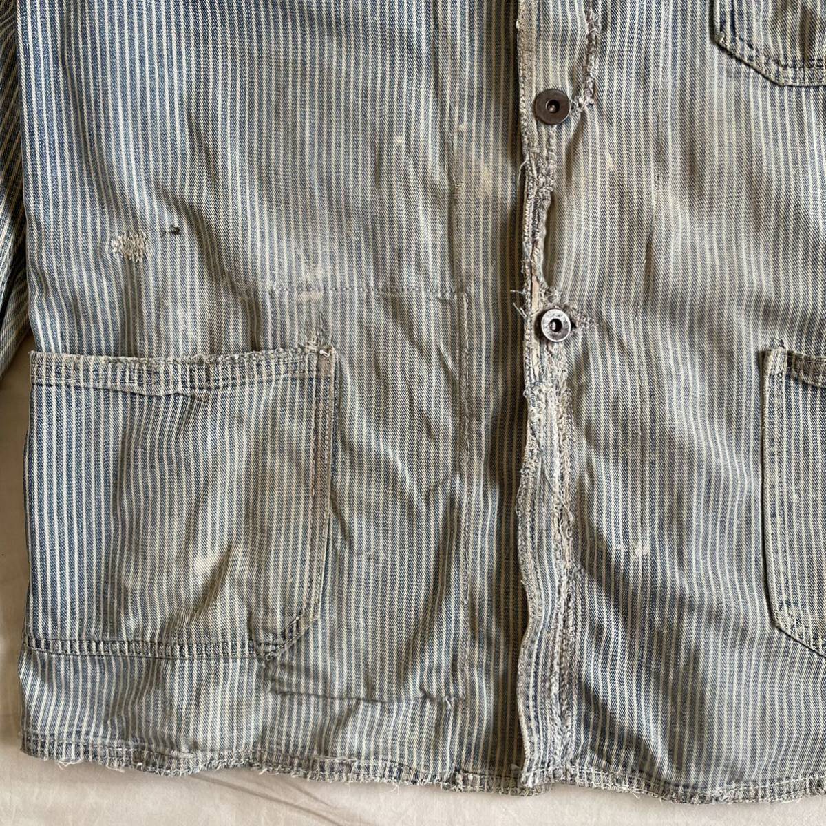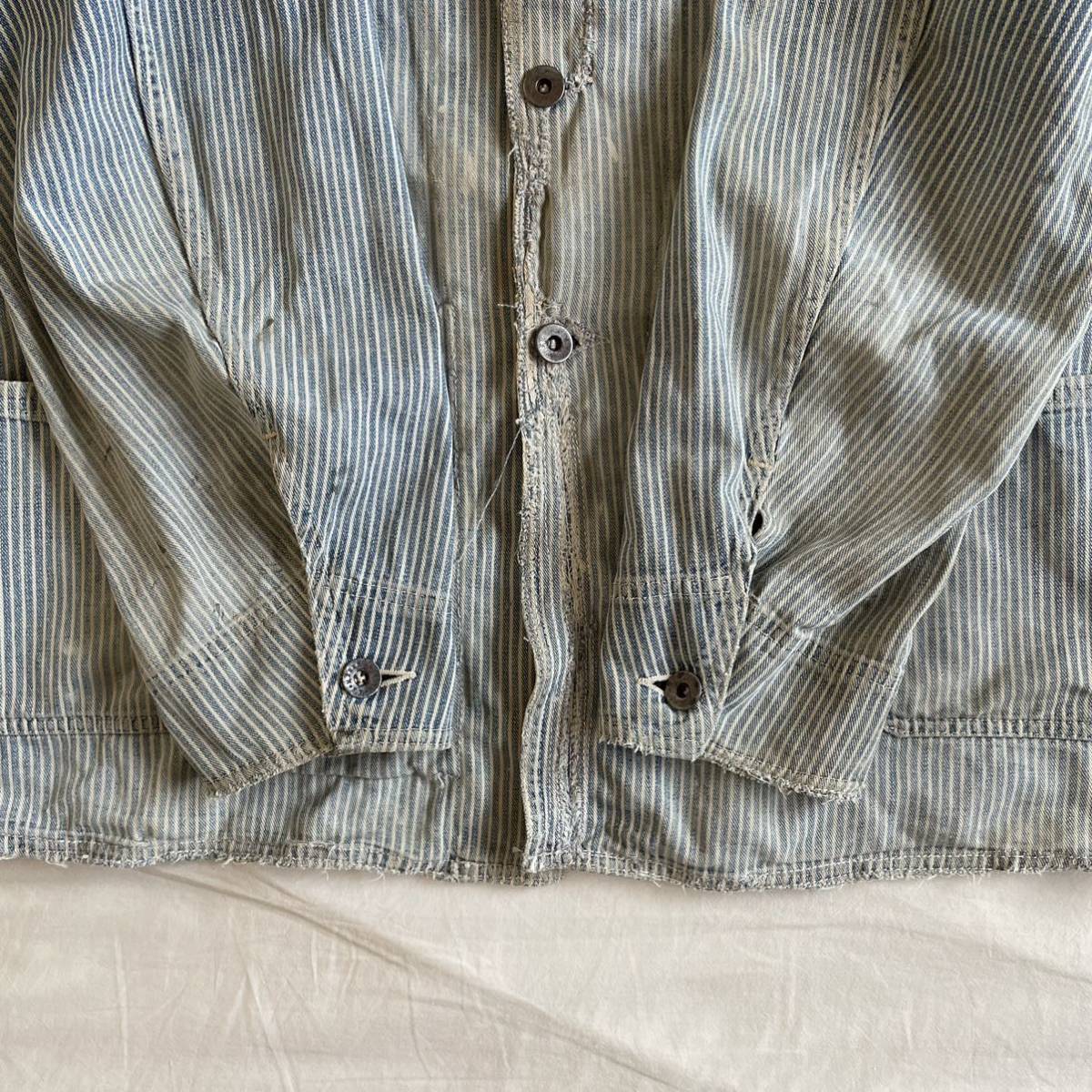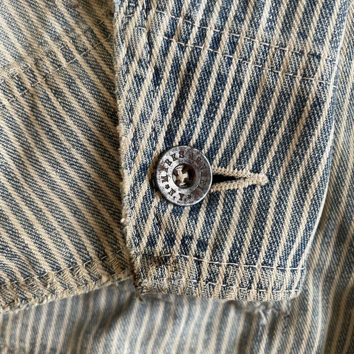 ヒッコリーストライプ生地でスタンドネック、メタル釦仕様とスペシャルな1枚。