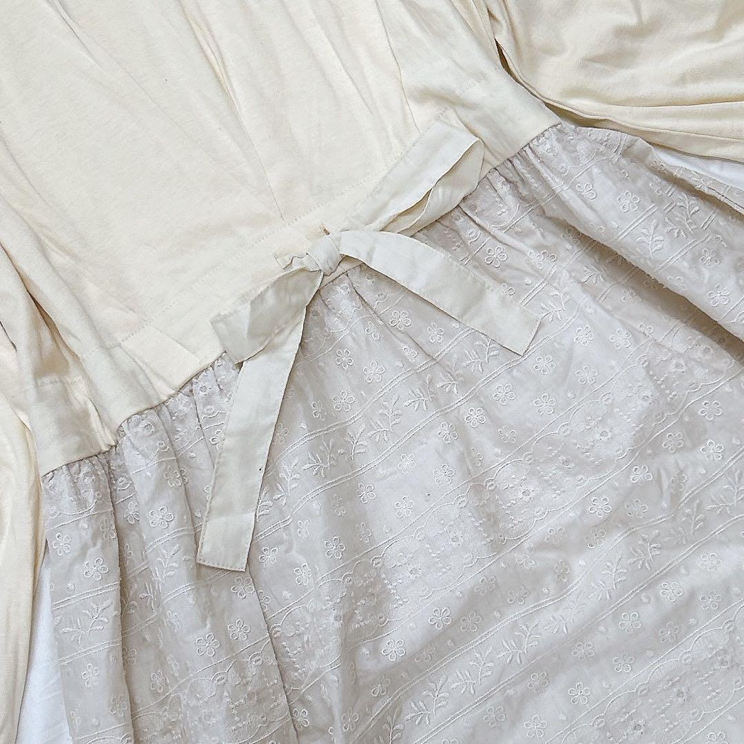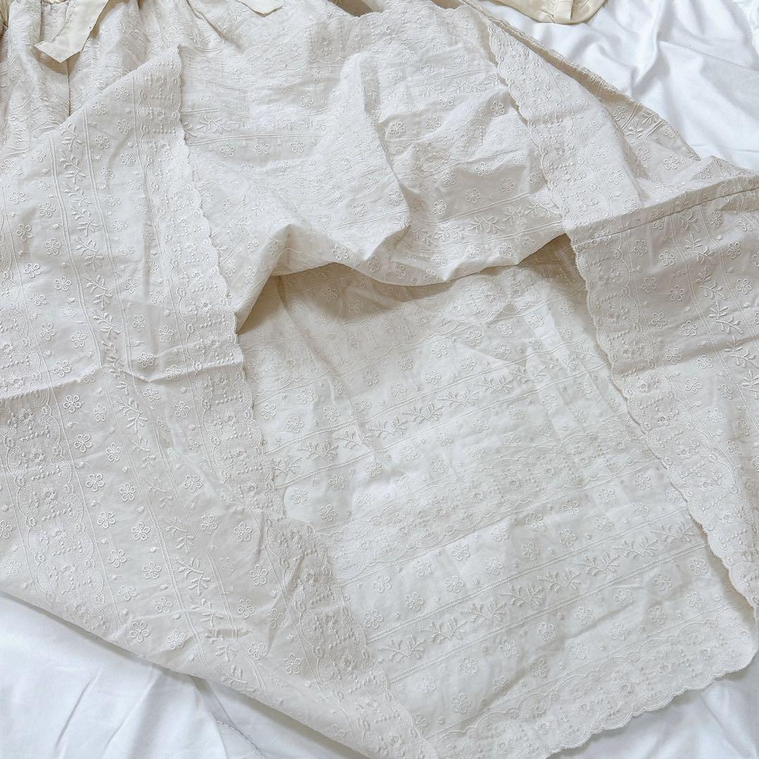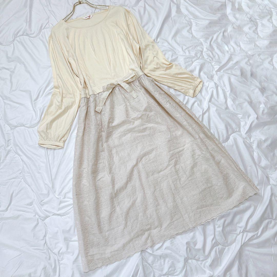 さらりとした長袖カットソーにウエストリボン、スカート部分は繊細な刺繍生地で上品さと可憐さを兼ね備えています。