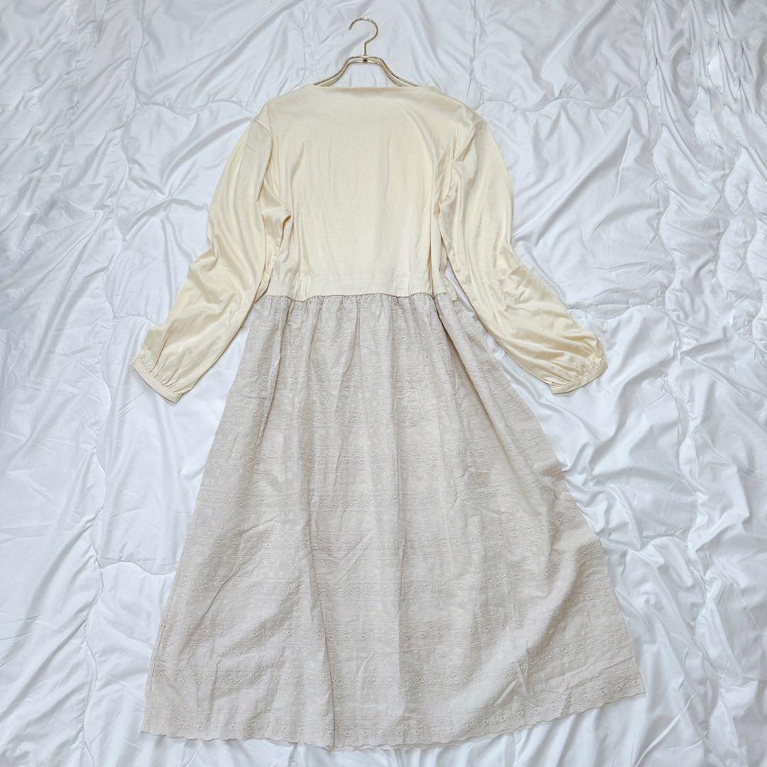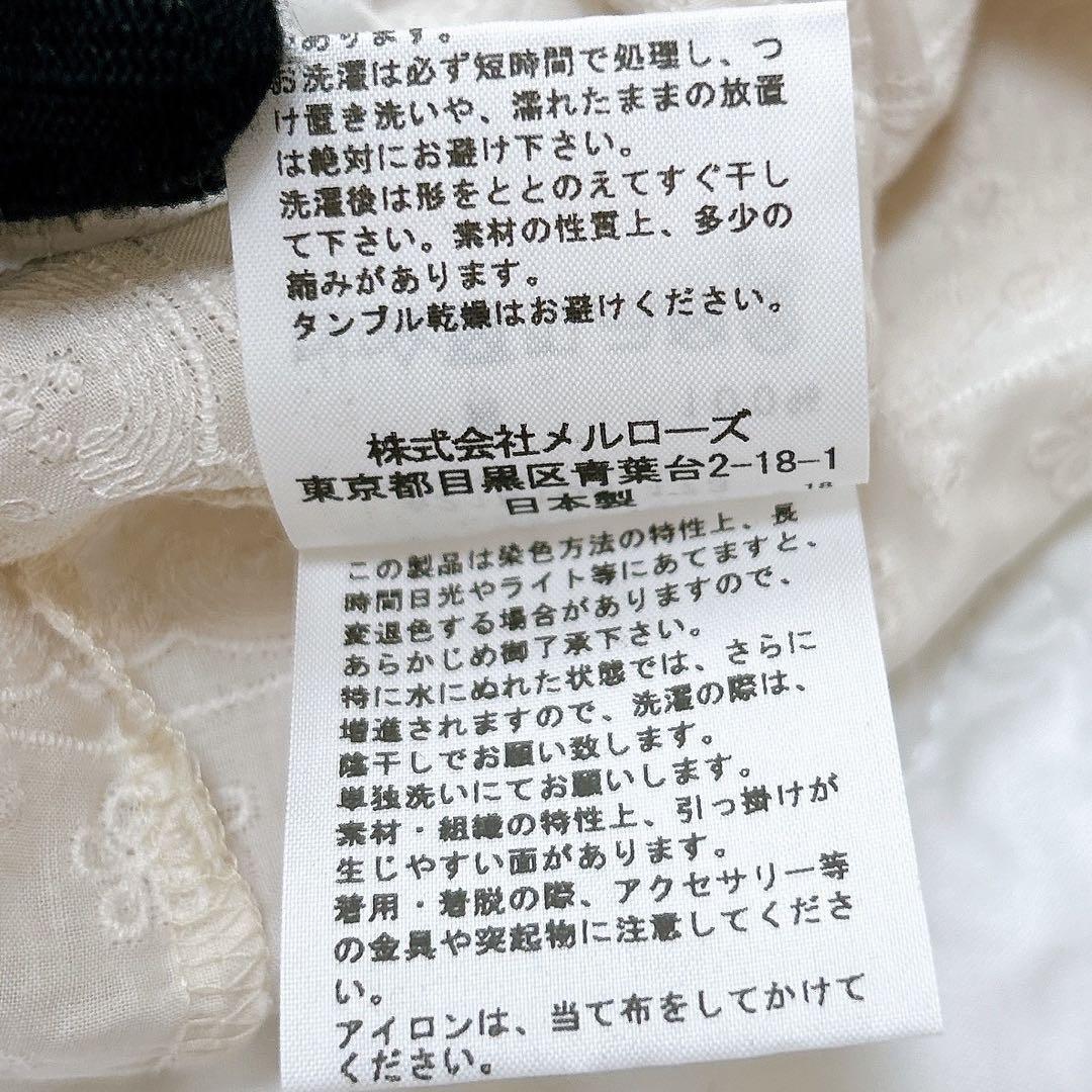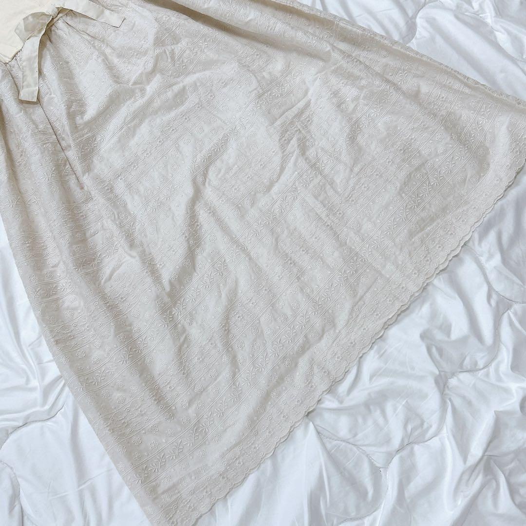 さらりとした長袖カットソーにウエストリボン、スカート部分は繊細な刺繍生地で上品さと可憐さを兼ね備えています。