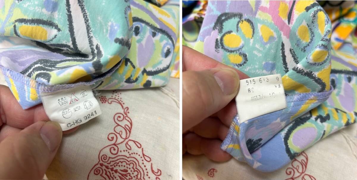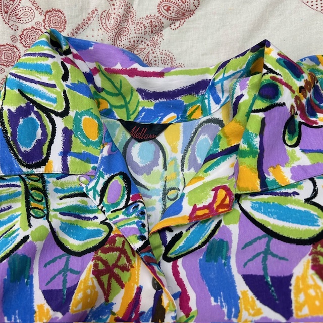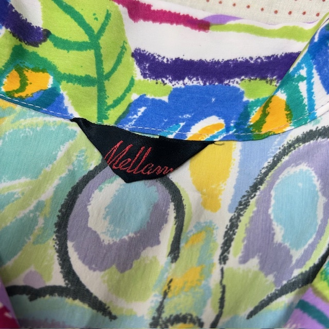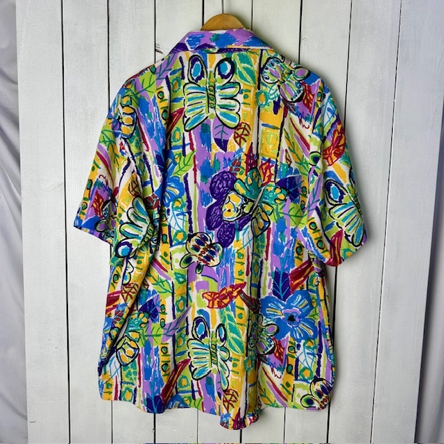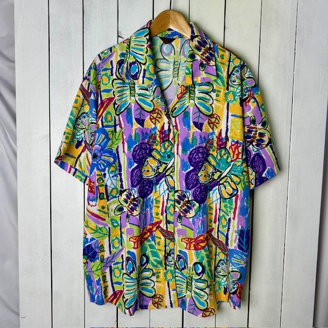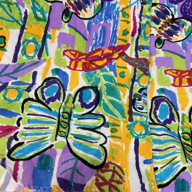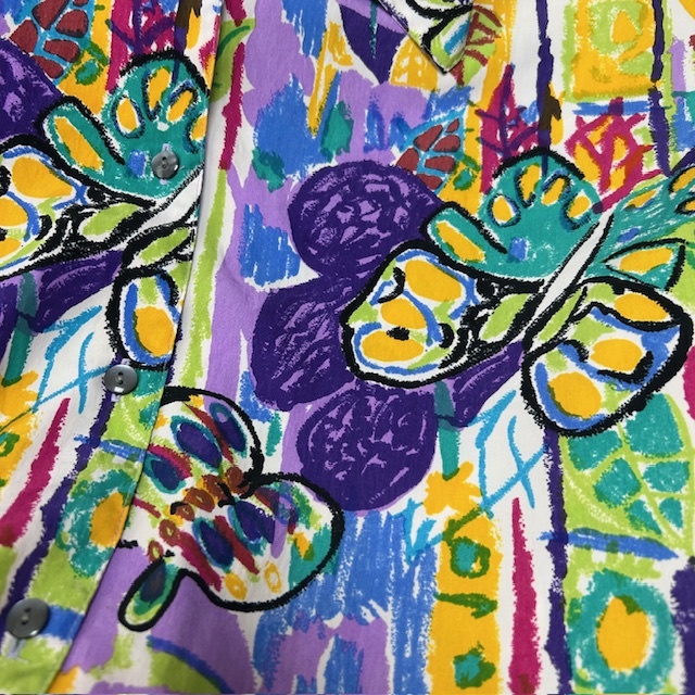 ●商品説明・・・80年代~90年代頃のレトロなオールド・ヴィンテージのアートというかはクレヨンで落書きしたようなカラフルでポップな花や蝶々のような総柄のとても可愛い半袖の開襟(オープンカラー)シャツ・ブラウスです。素材はポリエステルで、風になびく薄手の涼しげな生地感です。サイズ表記は無いですが、身幅的にL~XL程度のサイズ感かと思います。(80年代頃~の物ですので、肩パッドのある物は出品前に取り外してあります)