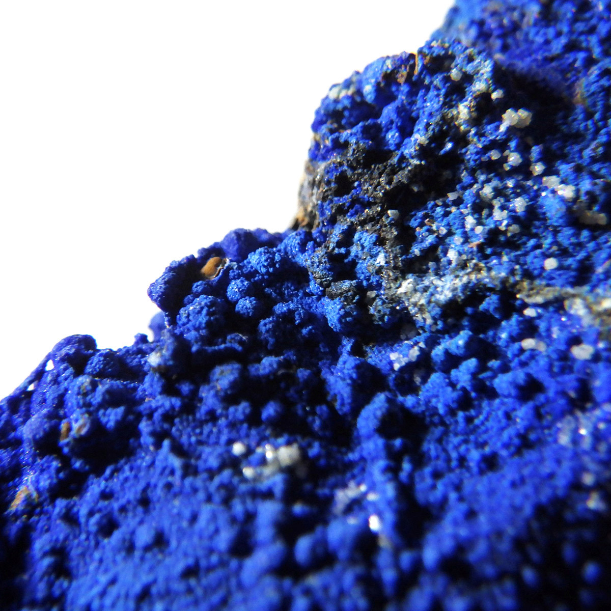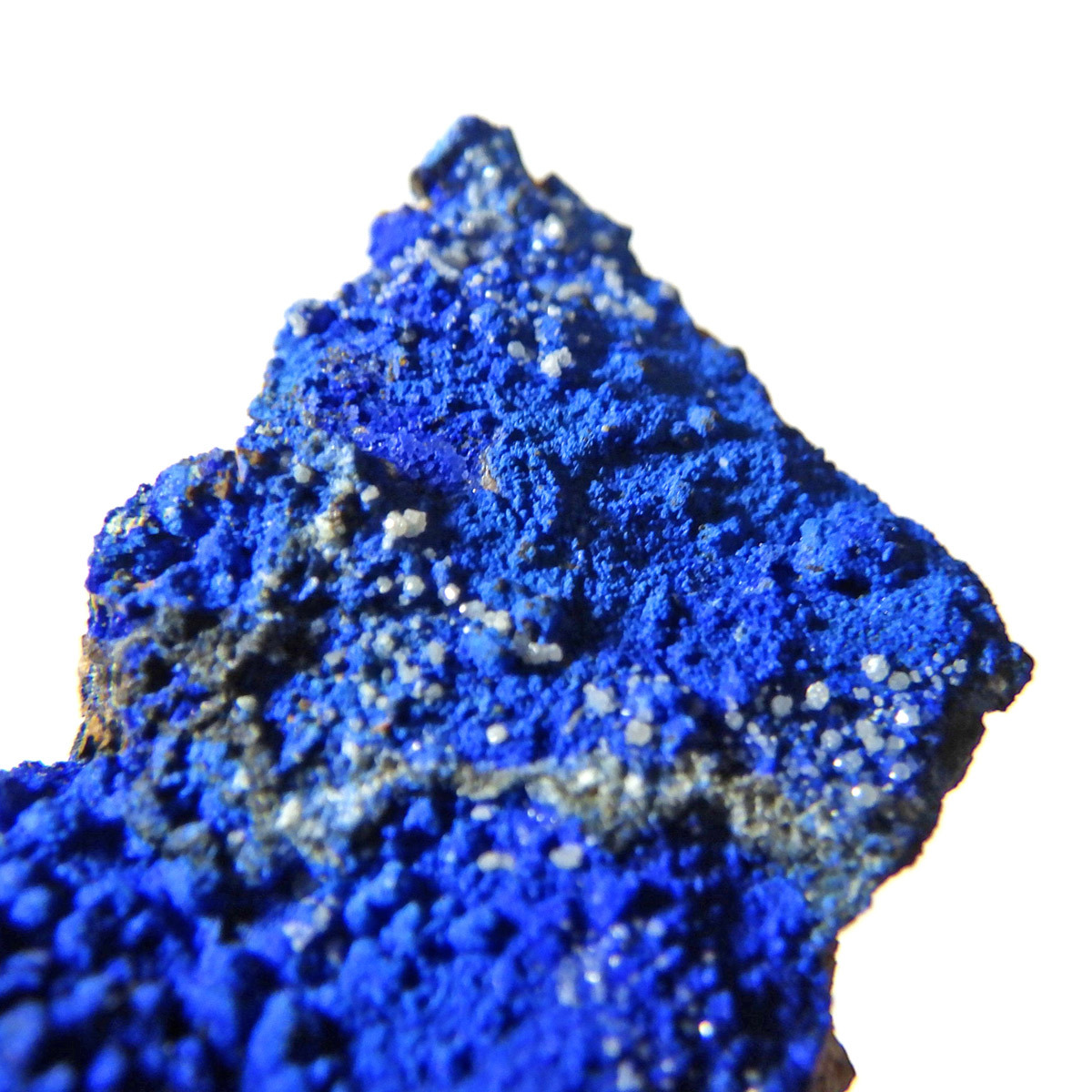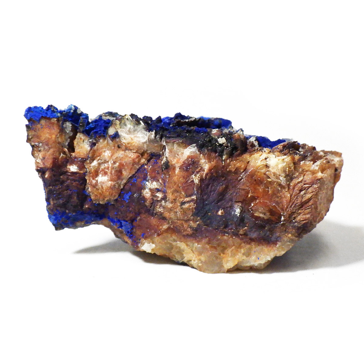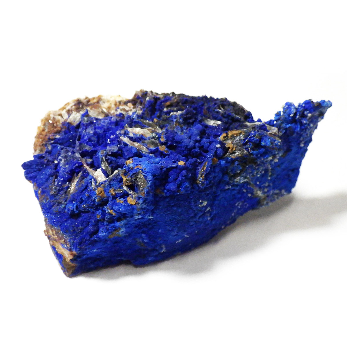 モロッコ産のアズライト結晶原石です。アズライトは産出量が少なく、鉱物コレクターの間でも非常に人気の高い希少石。中でもモロッコ産は、深く濃いブルーと美しい結晶構造を持つことで知られ、その美しさは世界トップクラスと評されています。バライト上にアズライトが結晶化されており、一部、鮮やかなグリーンのマラカイトとの共生も見られます。見る角度によってキラキラと表情を変える群青色の輝きは、まさに自然が生み出した芸術品です。