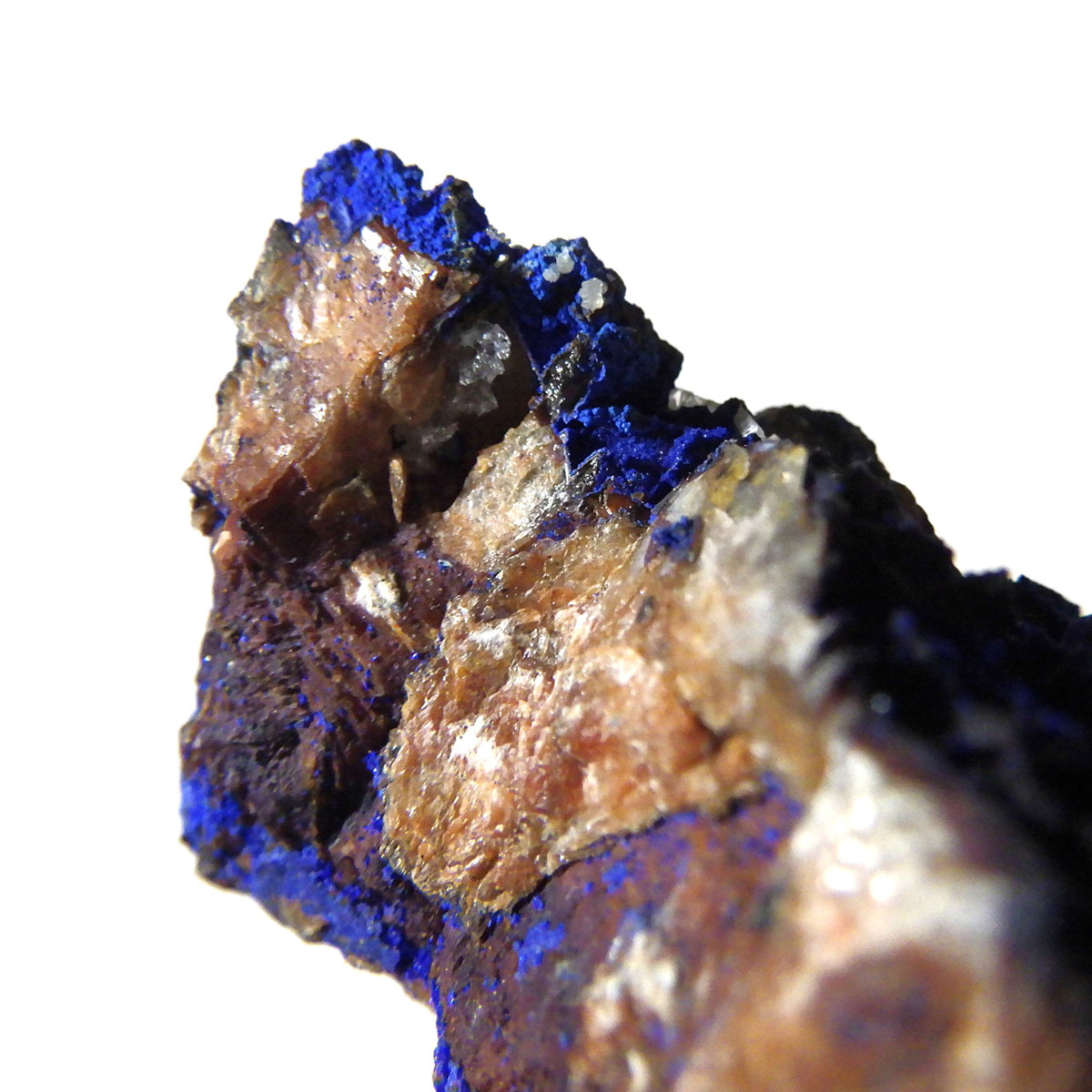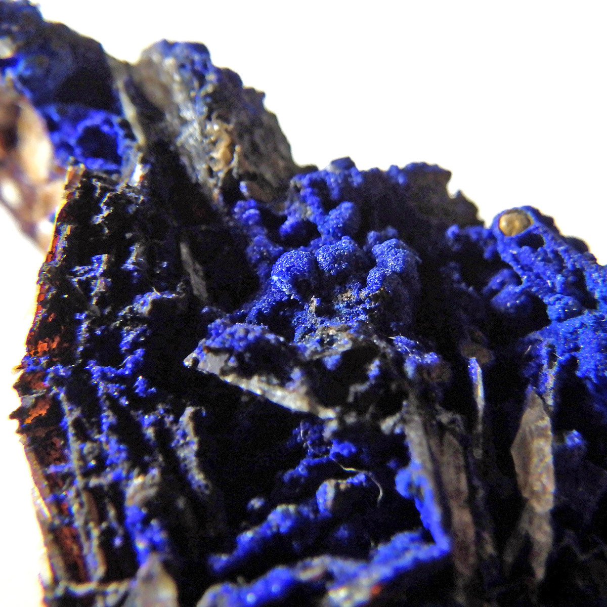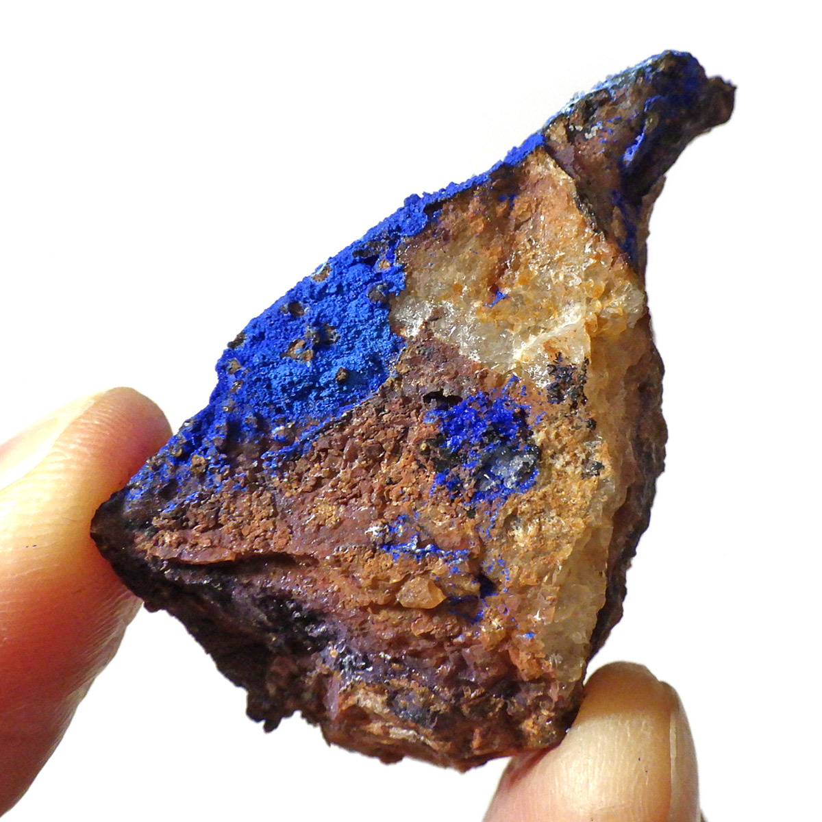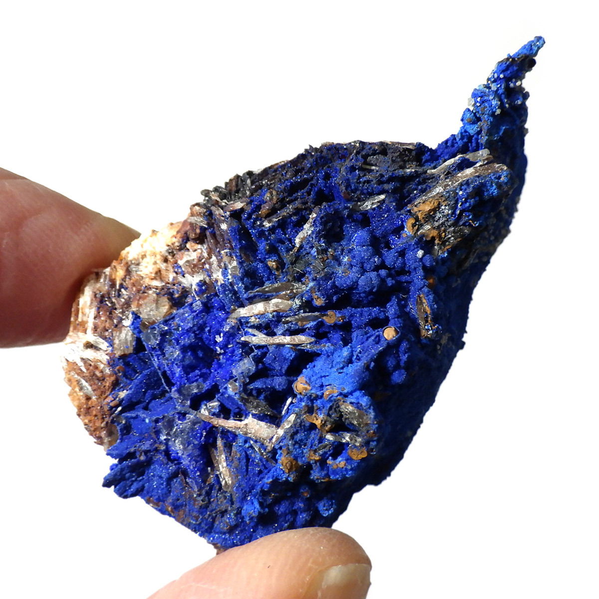 モロッコ産のアズライト結晶原石です。アズライトは産出量が少なく、鉱物コレクターの間でも非常に人気の高い希少石。中でもモロッコ産は、深く濃いブルーと美しい結晶構造を持つことで知られ、その美しさは世界トップクラスと評されています。バライト上にアズライトが結晶化されており、一部、鮮やかなグリーンのマラカイトとの共生も見られます。見る角度によってキラキラと表情を変える群青色の輝きは、まさに自然が生み出した芸術品です。