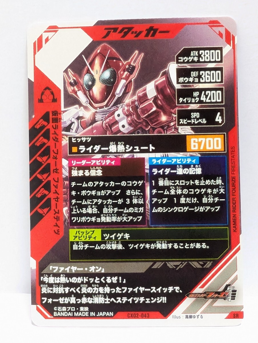 「仮面ライダーバトル ガンバレジェンズCX2弾 仮面ライダーフォーゼ ファイヤーステイツ(SR CX02-043)」を出品します。「おまとめ」可能な方は4枚までミニレター送料85円でお取扱いできます。5枚以上の場合は定形郵便で送料別途計算となります。