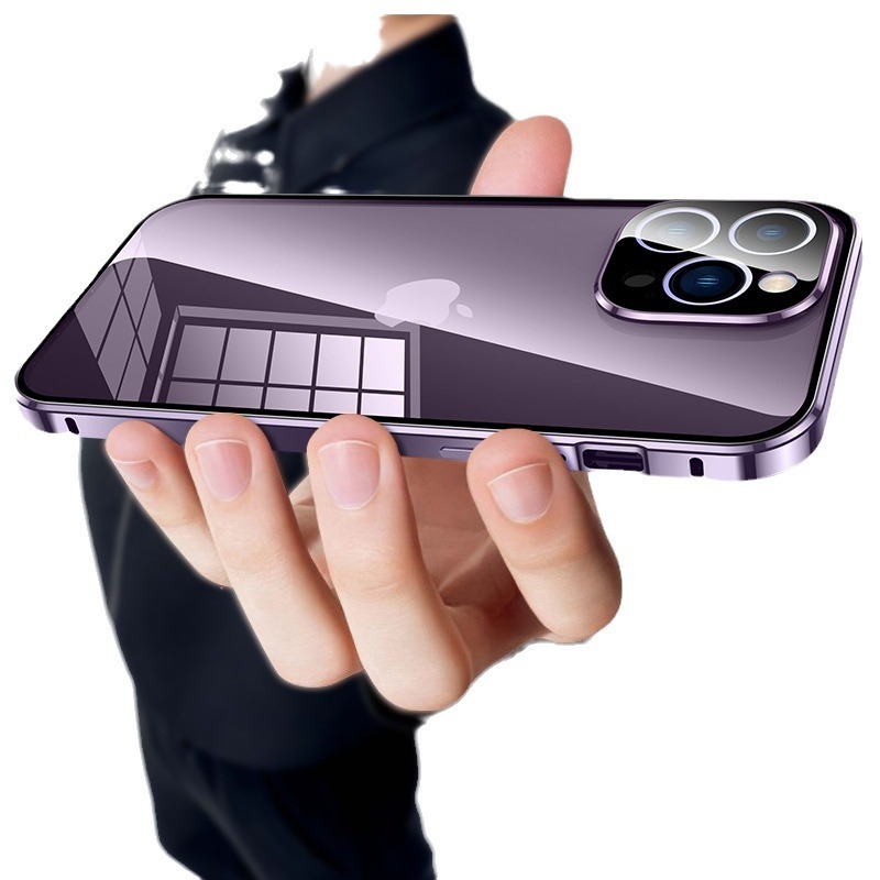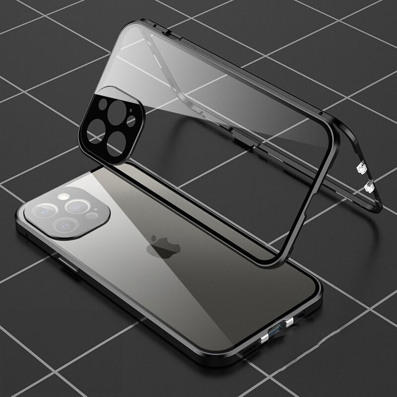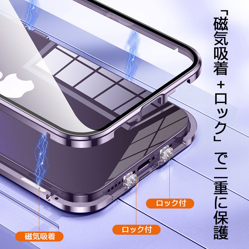 iPhone 14 Pro用 ケース ブラック 黒色 強化ガラス ロック付き マグネット式 アルミ合金フレーム