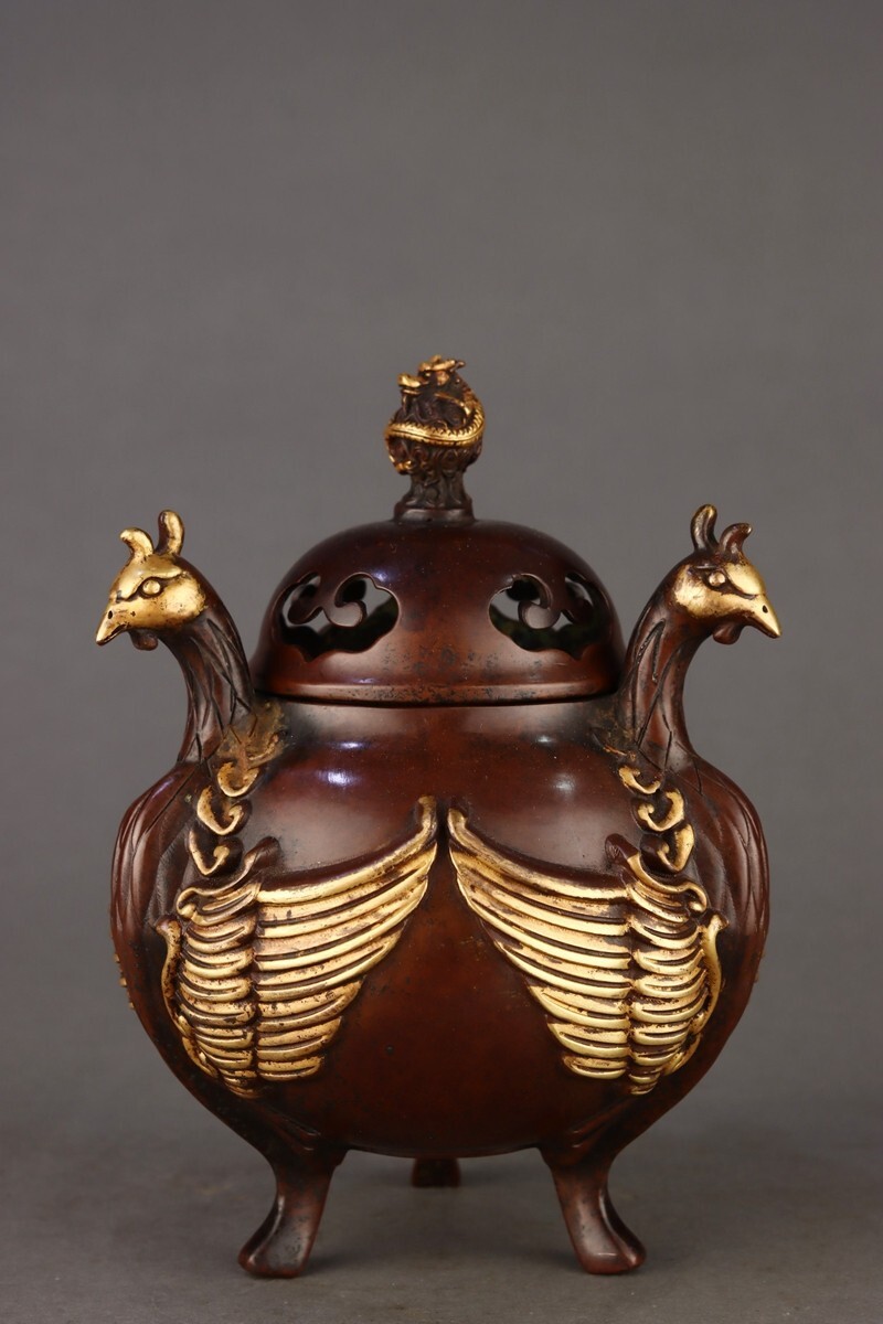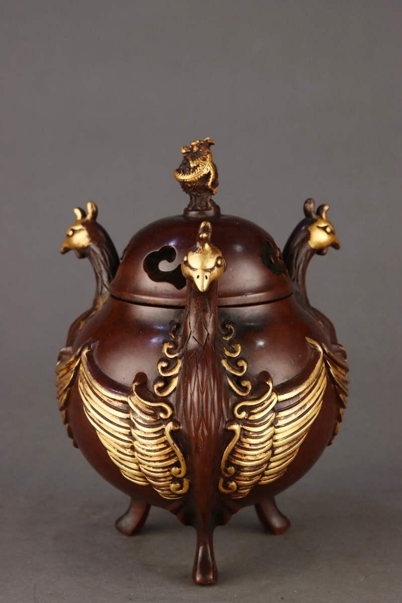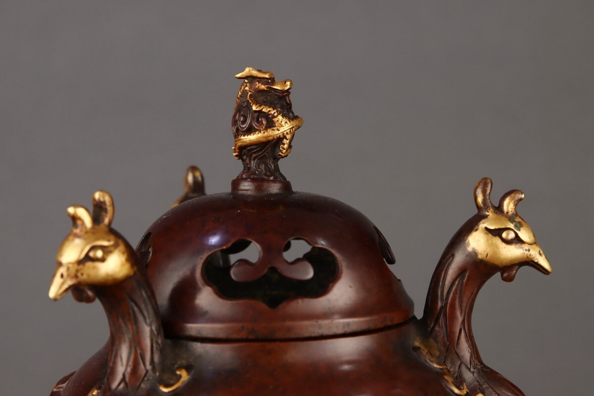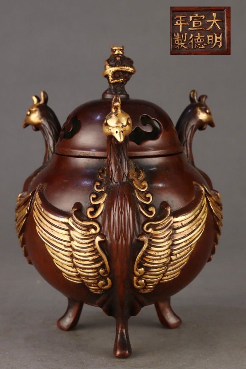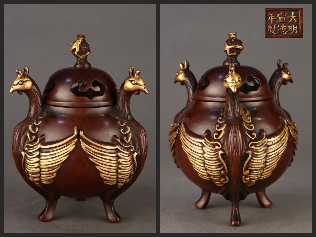 【瓏】古銅鏨刻彫 塗金龍鈕蓋 三鳳凰耳香薰炉 大明宣徳年製 銅器 古美術 骨董品 香道具 蔵出