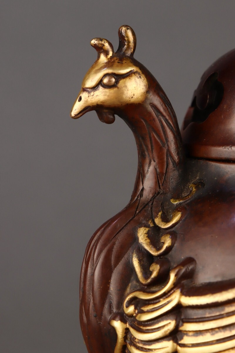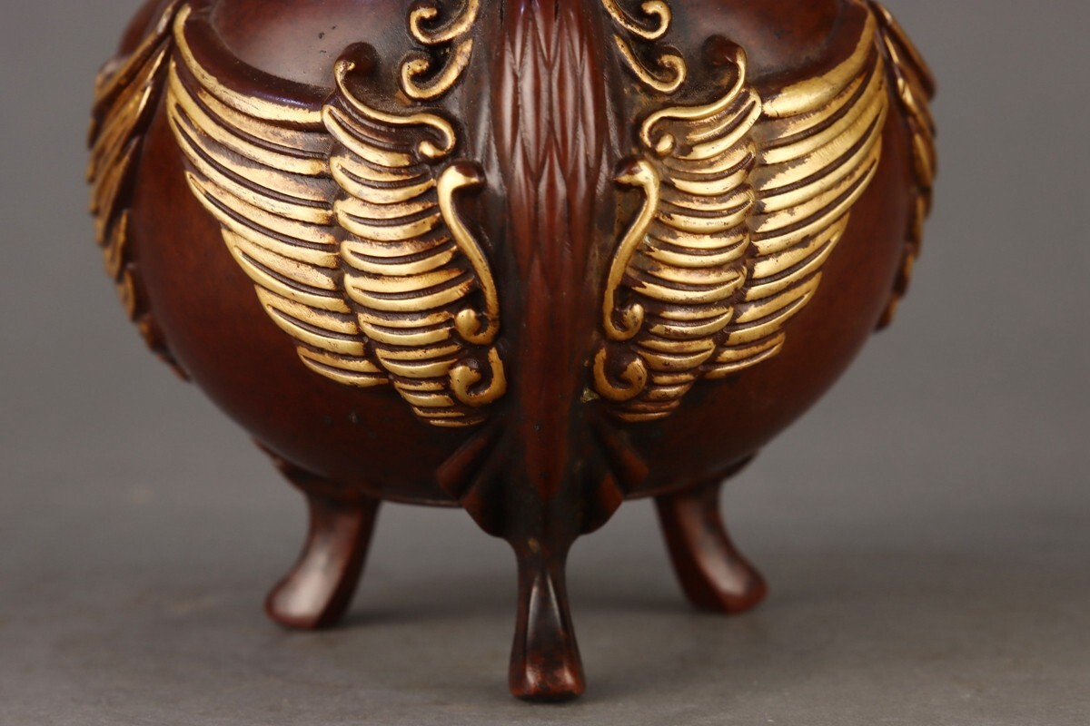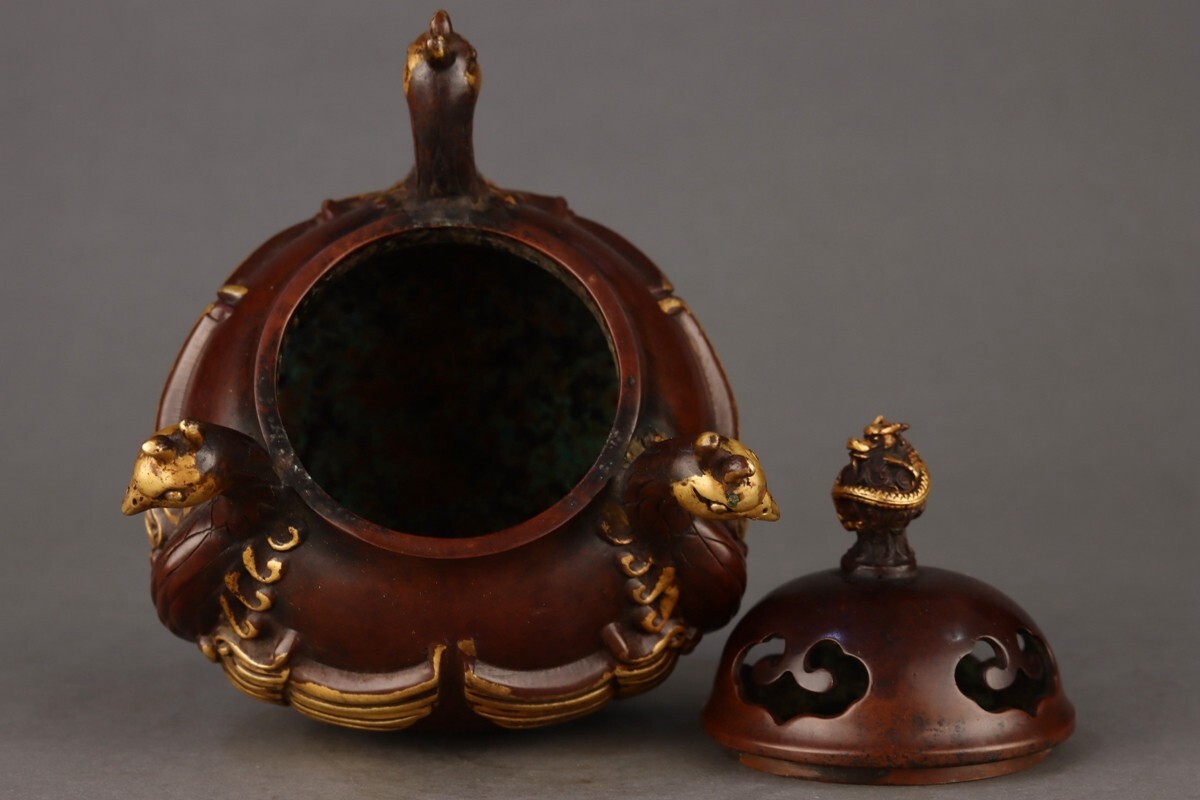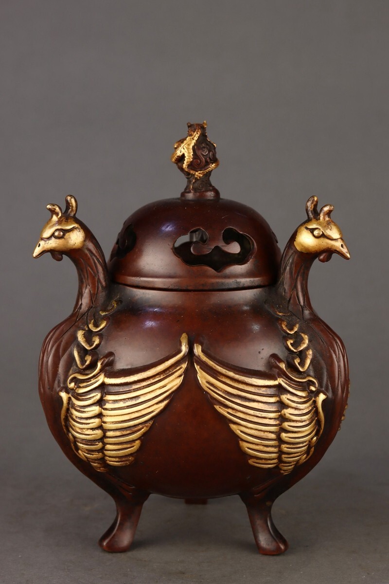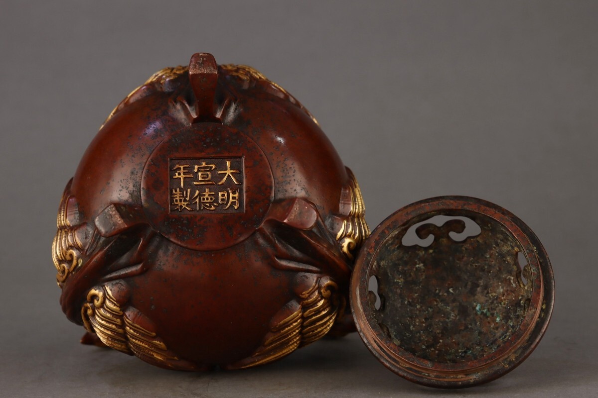 【瓏】古銅鏨刻彫 塗金龍鈕蓋 三鳳凰耳香薰炉 大明宣徳年製 銅器 古美術 骨董品 香道具 蔵出