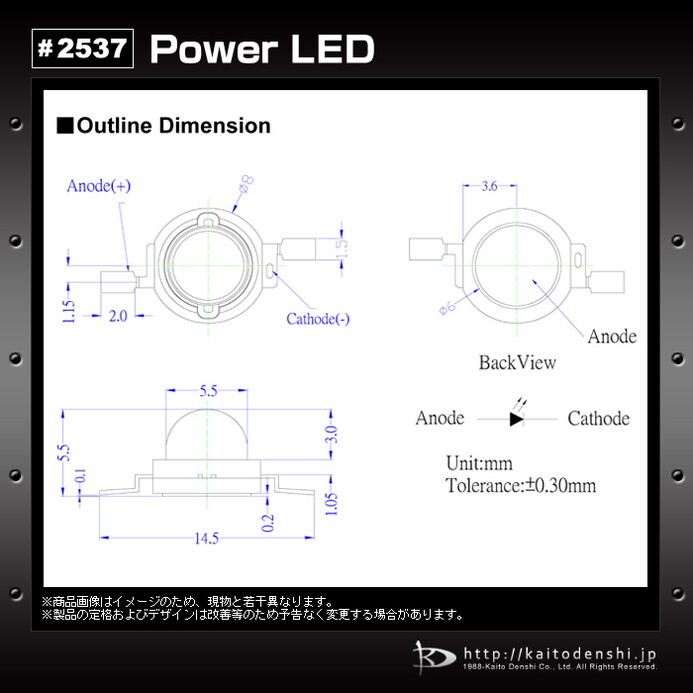 Power Output:3w Model: KD-JP3W-O IF:700mA VR:2.0-2.2V Topr 200℃ LM:90~100LM CCT:600~605NM Emitted Color:オレンジ ヒートシンク:無し | |