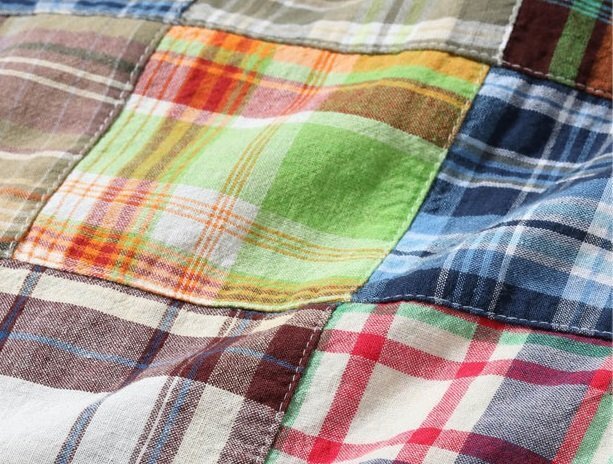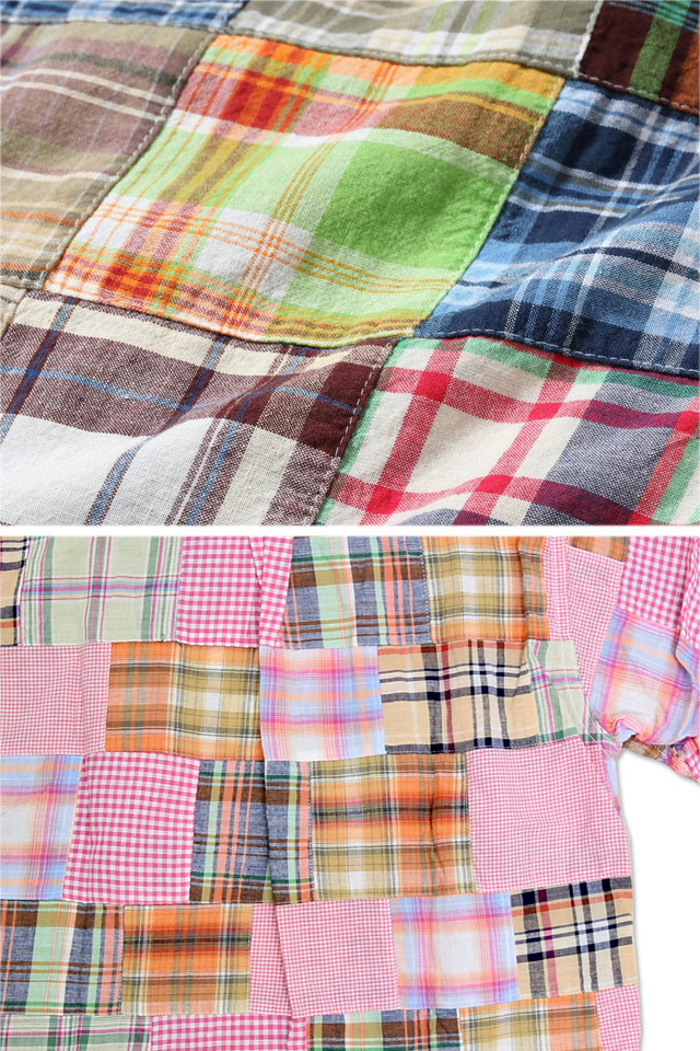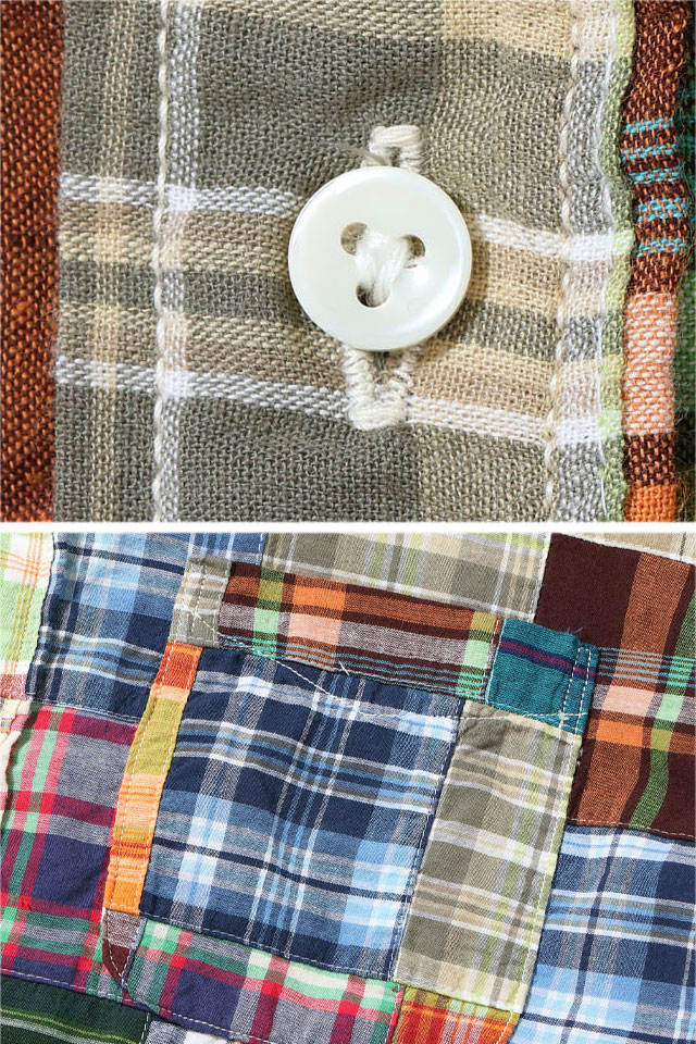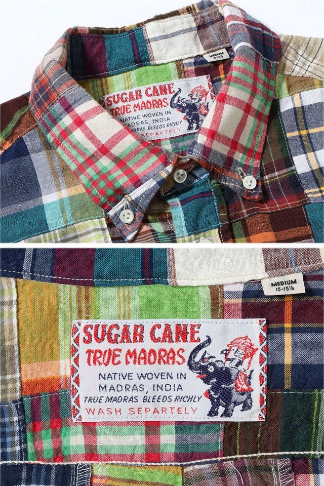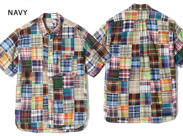 今までにない特殊な素材からデニムを製作している「SUGAR CANE」から「マドラスチェックパッチワーク半袖シャツ(SC39515)」のご紹介です。 1950-1960年代のアイビースタイルには欠かせないインド南東部のマドラス(現チェンナイ)で織られたチェック生地をパッチワーク状にして使用しています。 国産では出せない風合いや色合いが特徴です。 ベースは両サイドにマチが付いたラウンドベース型のBDシャツ。 襟元にTRUE MADRASラベルが縫い付けられ、フロントには特注の3つ穴貝ボタンを使用しています。 | ||||||||||||||||||||