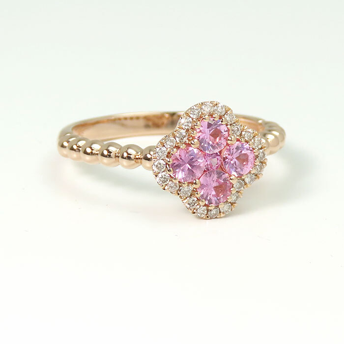 商品説明 | フラワーモチーフにセッティングされたピンクサファイアとダイヤモンドがキラキラと輝く上品なリングです。 |