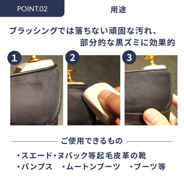 消しゴムのようなイメージで軽く擦ると、起毛皮革の毛の上に付着した頑固な汚れを落とせます。