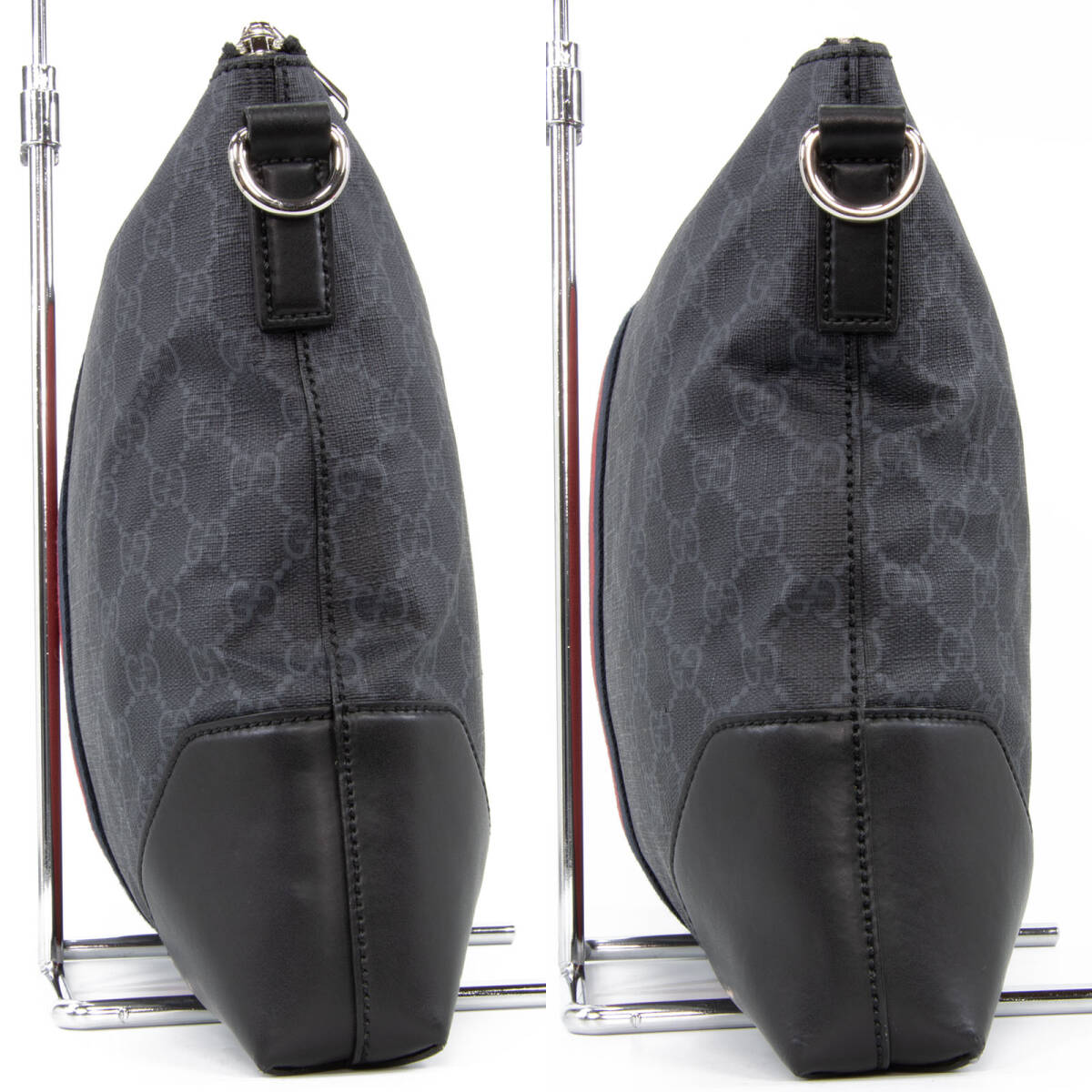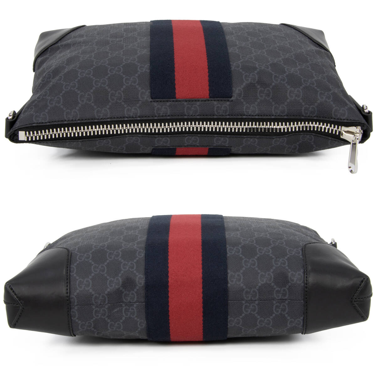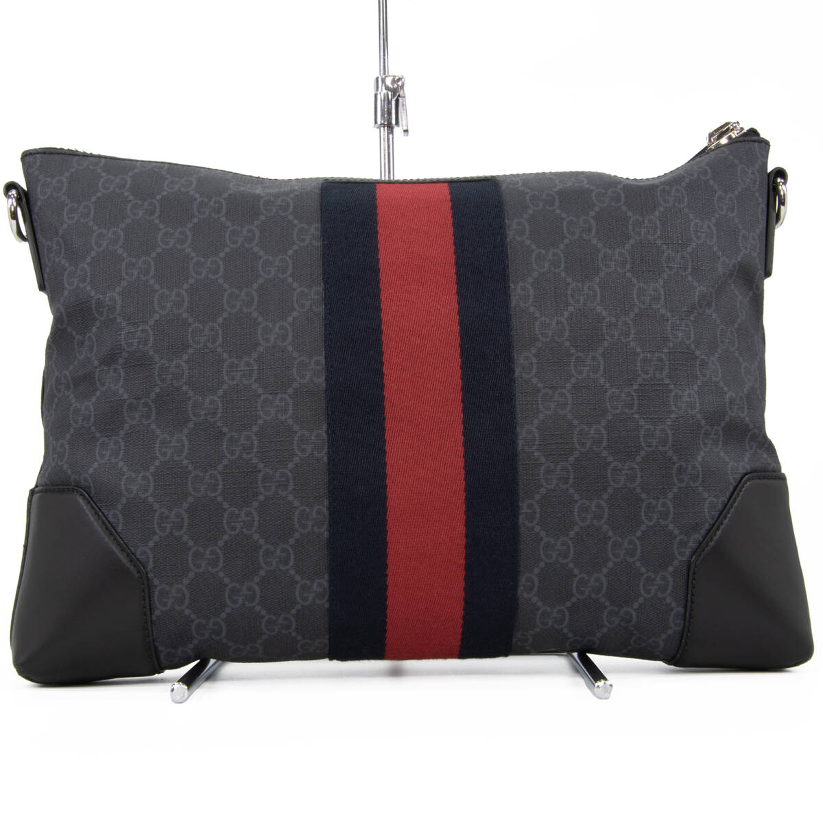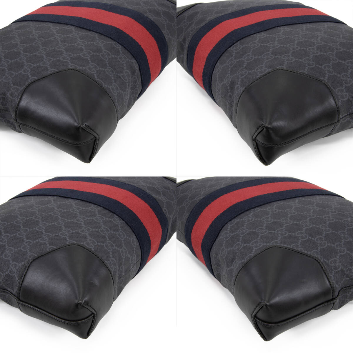 落ち着いた色合いのGGスプリームキャンバスの中央に、一目でグッチとわかるウェビングラインが大胆に配されております。