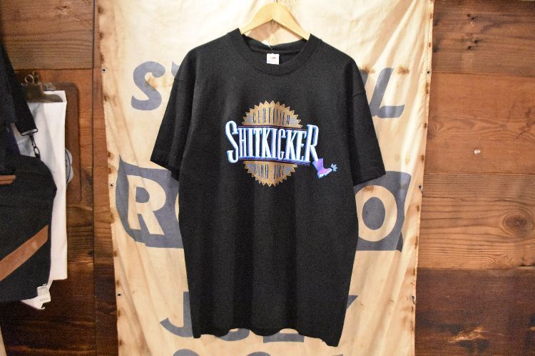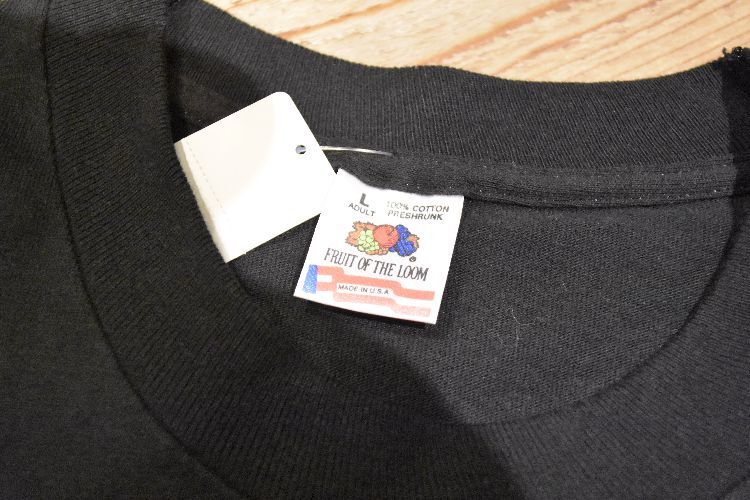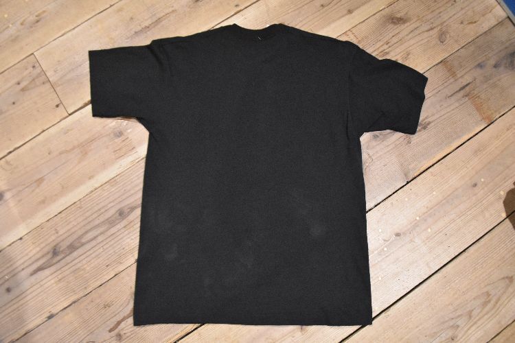グッドプリント◎90sビンテージFRUITOFTHELOOMフルーツボディ半袖クルーネックプリントTシャツLブラック黒100綿アメカジストリート w729