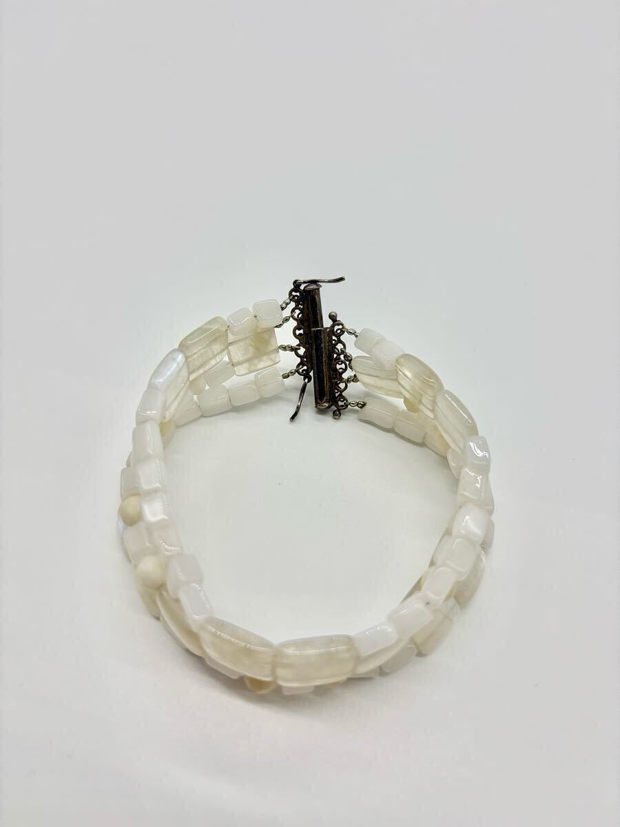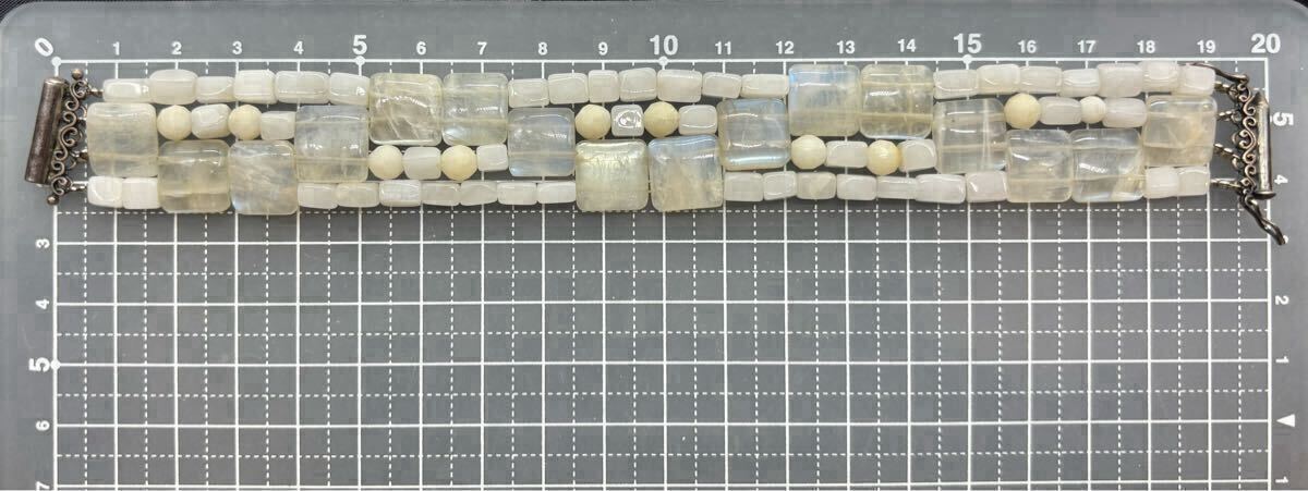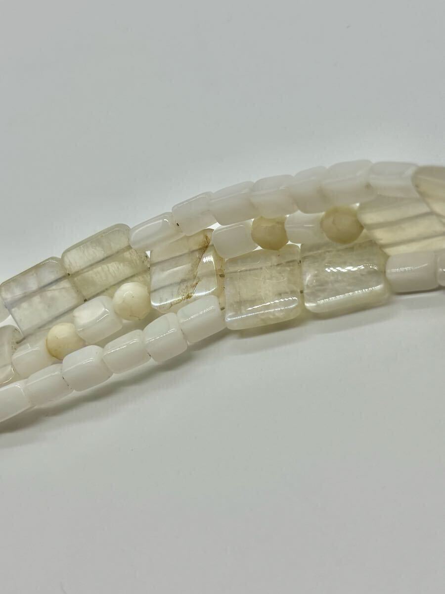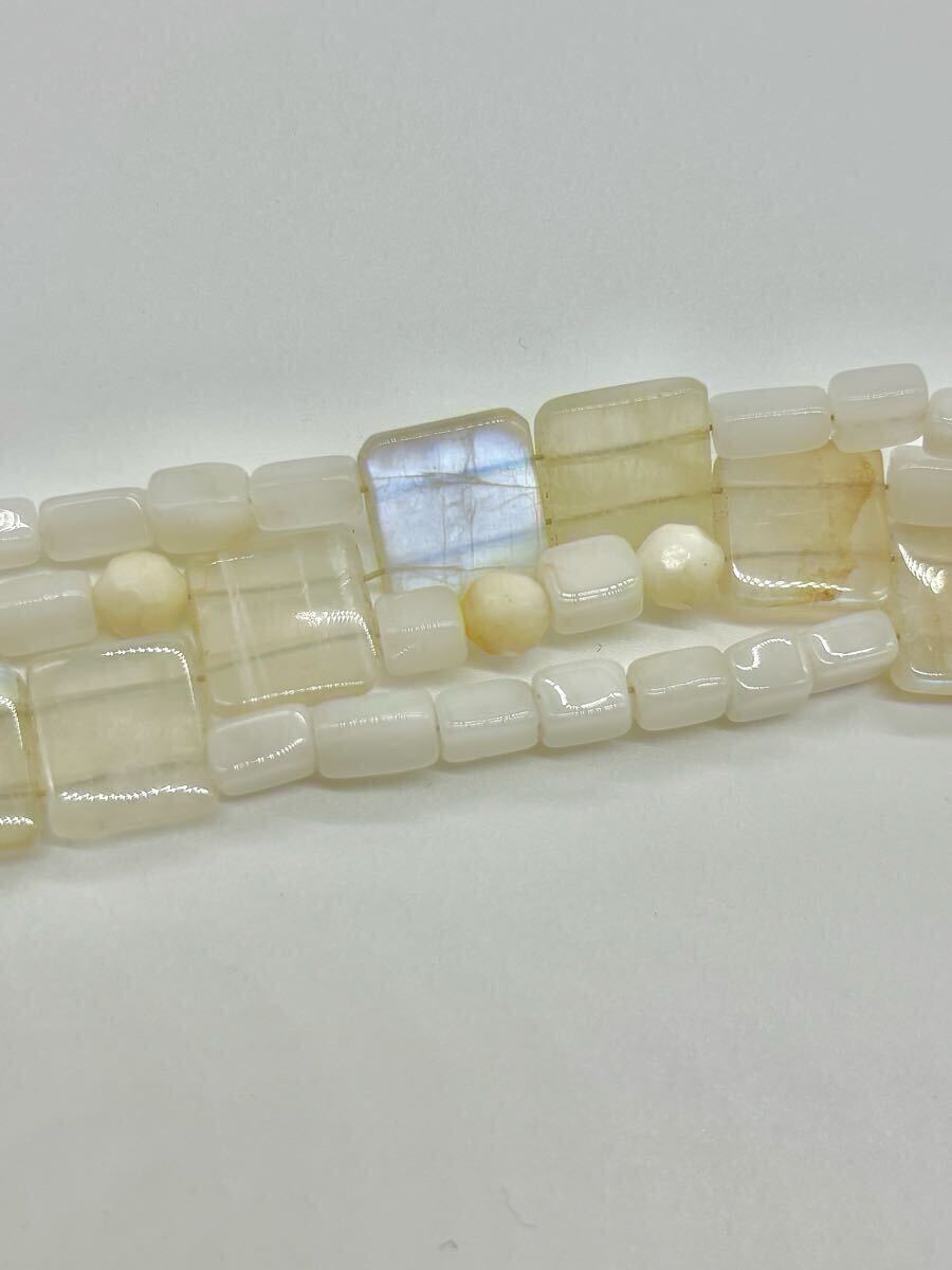 ムーンストーンの間の丸や四角いビーズも天然石かと思いますが種類は不明です。