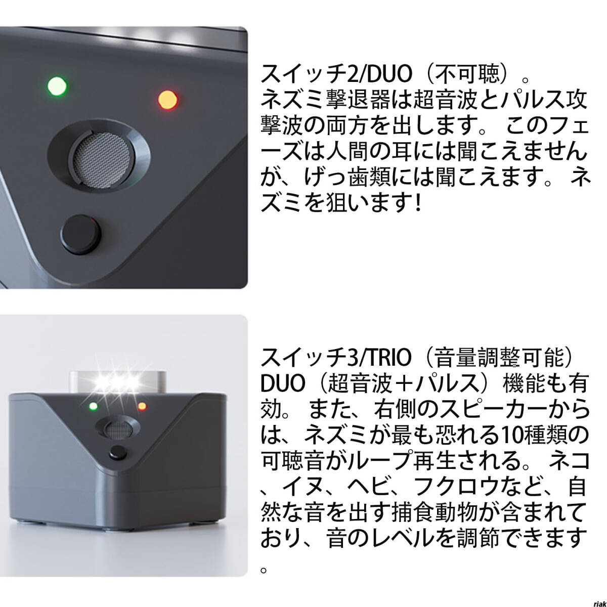 360度全方位に超音波と電磁波を発射し、ネズミやゴキブリ、蚊など多種多様な害虫に不快感を与えて追い払います。