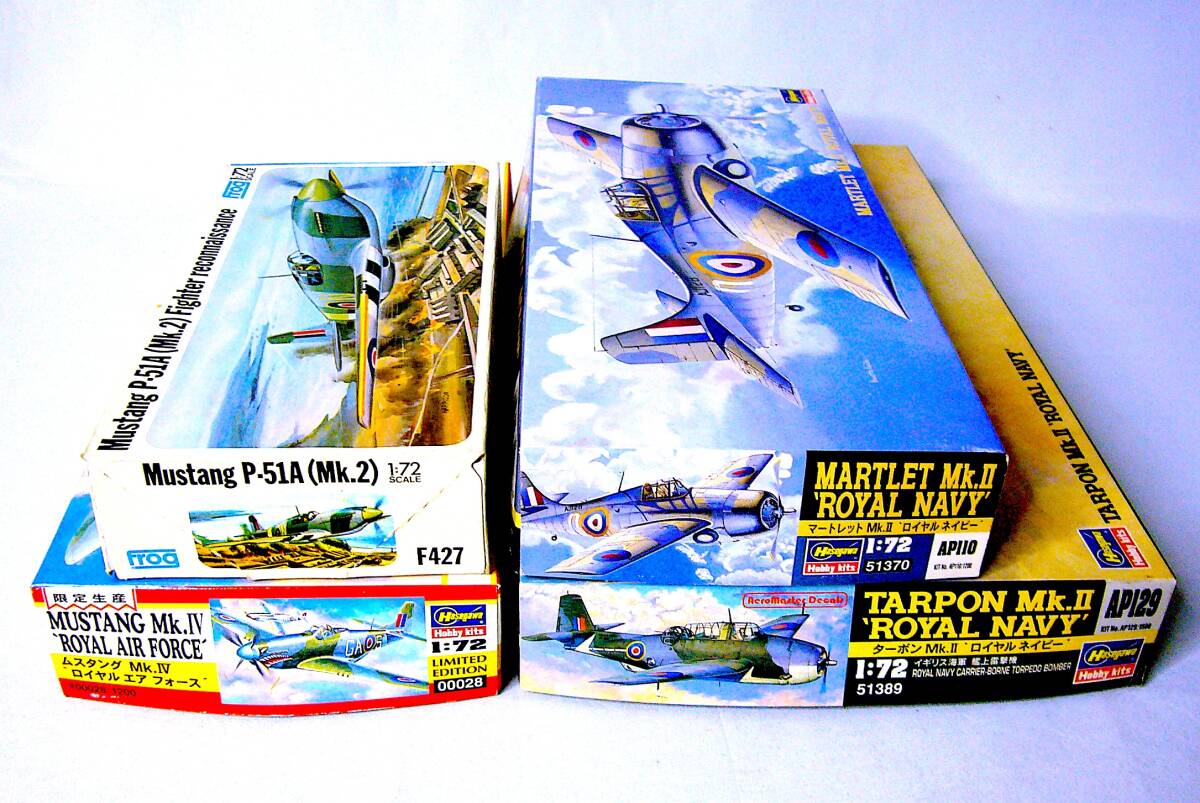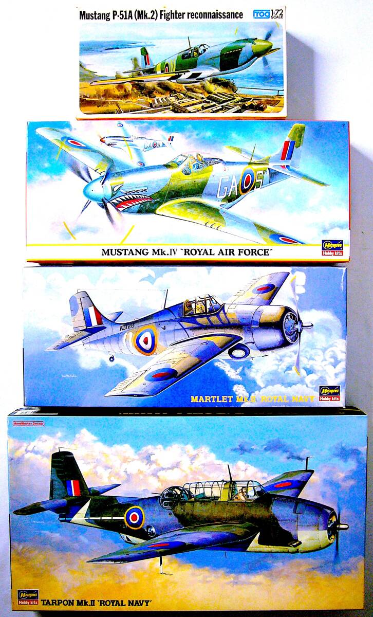 フロッグ/ハセガワ 1/72 ムスタング P-51A (Mk.2) / ムスタング Mk.IV “ロイヤル エア フォース” / マートレット Mk.II “ロイヤル ネイビー” / ターポン Mk.II “ロイヤル ネイビー” のプラモデル(下記) 4個まとめ売り です。