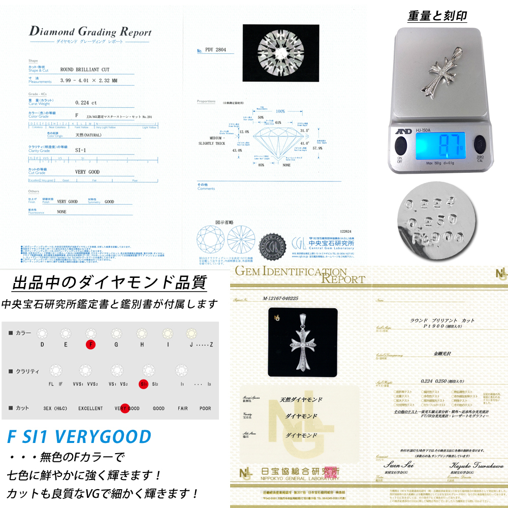| 品質について | 日本で一番支持されている中央宝石研究所の鑑定書付きです! 三角バチカン :センターダイヤ 0.224ct F-SI1-VERYGOOD 鑑定書写真の品質をご参照ください! 無色で照りの良いダイヤモンドです。 |
