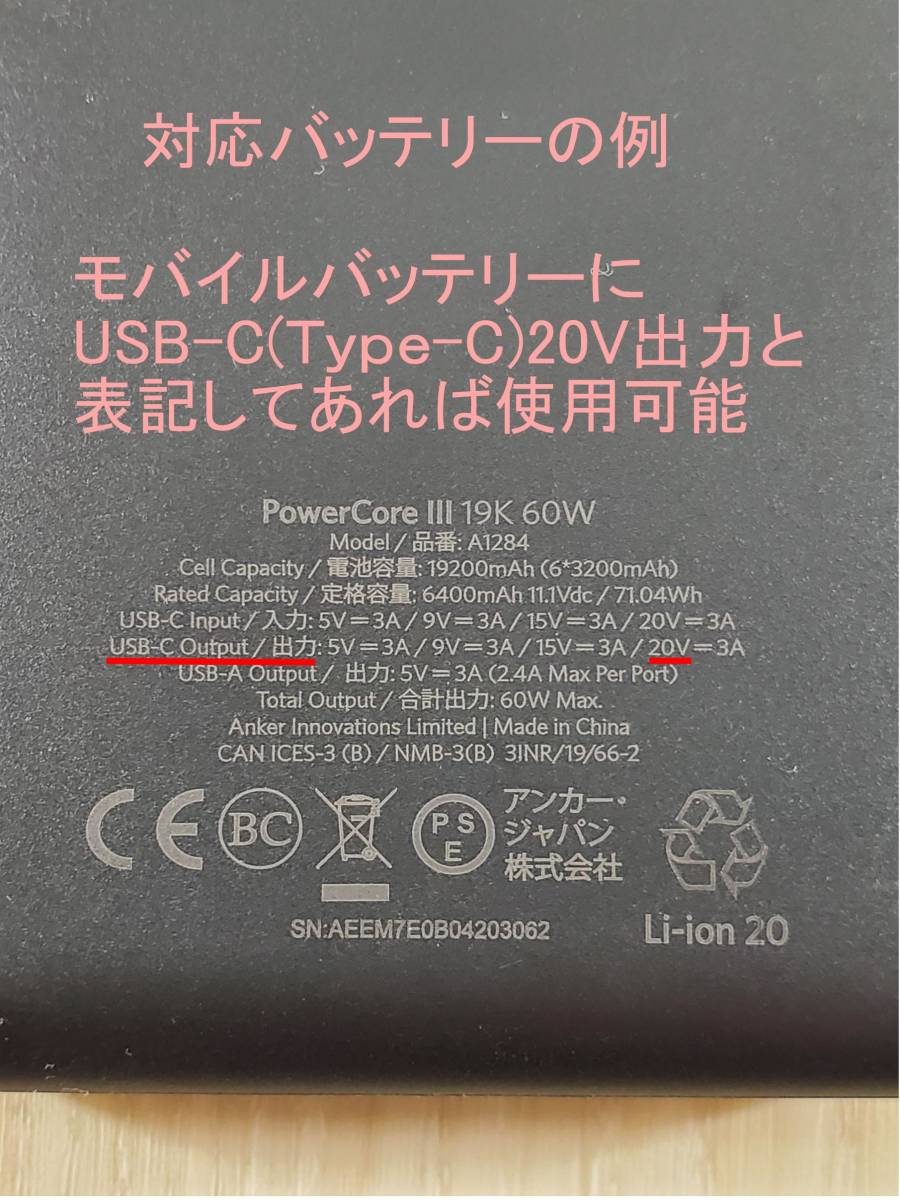 ★純正バッテリーの代わりに20Vを出力できるType-C端子のあるモバイルバッテリーで運用します。