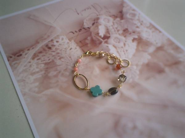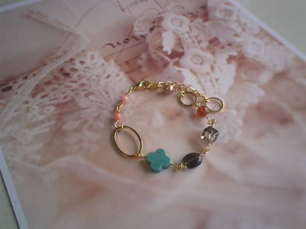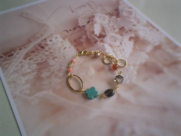 ジゼルの宝石箱・・シリーズです♪春色パッチワーク・・やさしい色を集めて春色のブレスレットです♪淡水パールや珊瑚、ターコイズ、スモーキークォーツにカーネリアンなどの丸玉やオーバル、フラワーやスクエアなどデザイン違いにデザインリングを合わせてロマンチックな表情です♪淡水パールは6ミリのポテト、珊瑚は4ミリの丸玉、スモーキークォーツは6ミリのスクエアや10ミリのオーバル、ターコイズは12ミリのフラワー、カーネリアンは6ミリの丸玉です♪長さは全長23センチ位で調節自由です♪お揃いのネックレスやピアスも出品しています♪シンプルで飽きのこないいつまでも着けられるデザインを考えて作りました!ハンドメイドをご理解頂いてノークレーム、ノーリターンでお願いします
