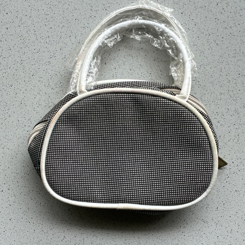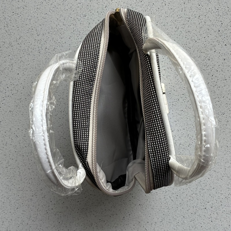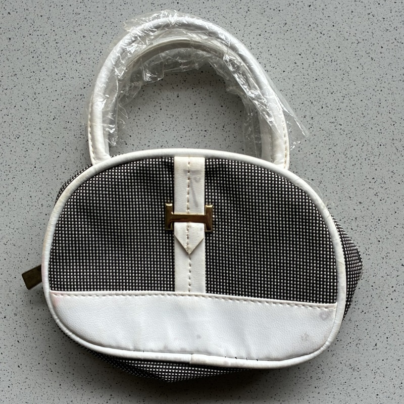 白と黒のドット柄の合成皮革ポーチ、丸みを帯びたデザインで使いやすい。