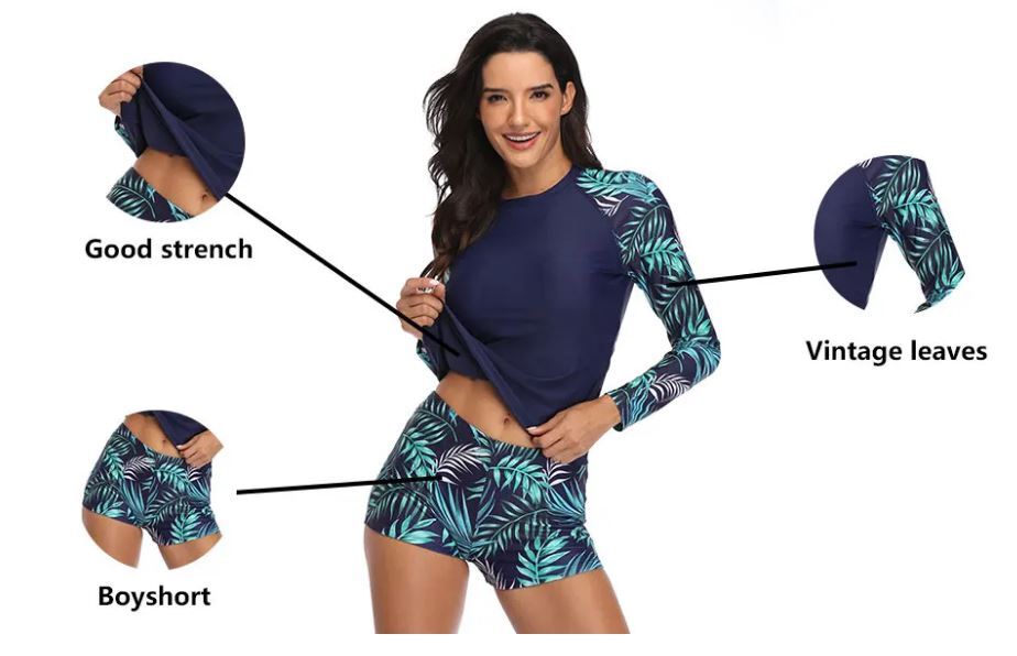 女性用ショーツ付ツーピース水着,ヴィンテージプリントラッシュガード,レトロプリント,サーフウェア,長袖