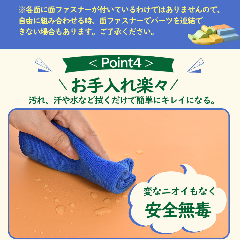 パーツの側面に面ファスナー付き、パーツを連結して集中する。